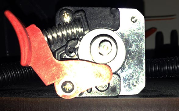 the other (ghetto yes but temporary and for testing) mods I did were increased the spring rate and also i used some pieces of abs filament to stop the ninjaflex filament from jumping behind the idler either to the front or back which was my original issue.. i also added tubing above where the filament comes through the top of the ezstruder.