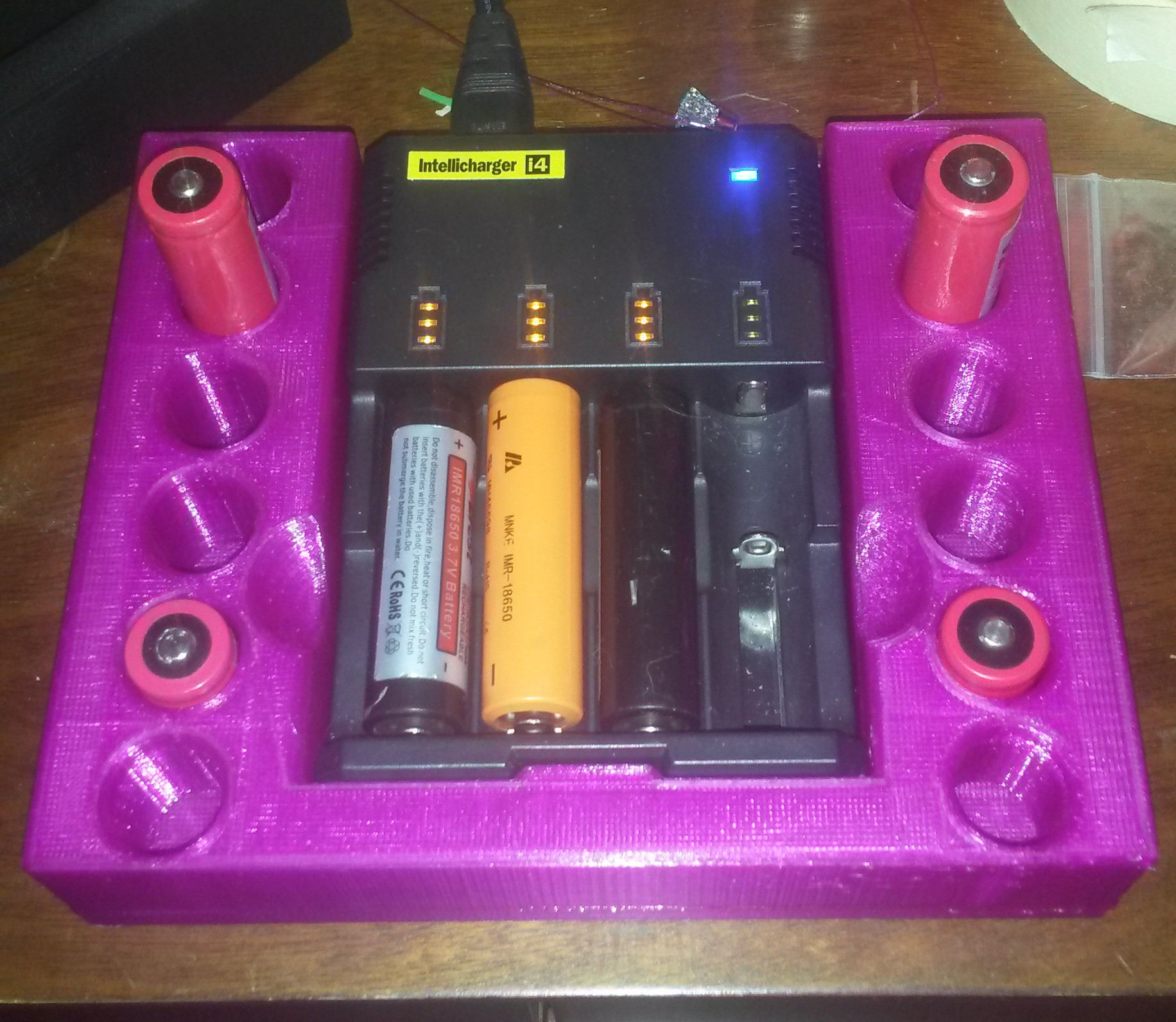 My girlfriend and I use E-cigs and have quite a collection. That means we also have quite a few batteries laying around, so I designed and printed an organizer for the charger and batteries. A friend saw it and wanted a purple one. I love this pearlescent filament.