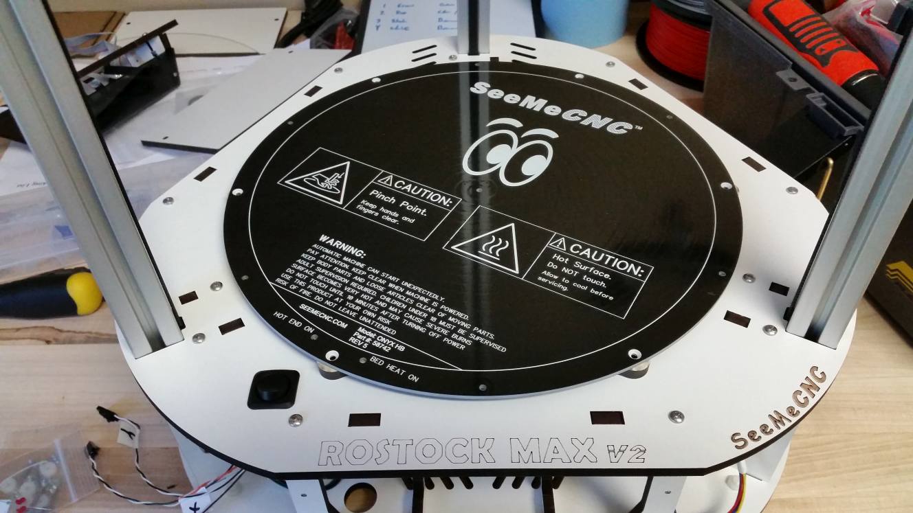 I have spent the past 16 days working on building my Rostock Max V2. Unfortunately the heated bed that came with the kit had cracks at the countersunk mounting holes and I waited until after Memorial Day to contact SeeMeCnc since they were out anyways. I worked on completing the build without the bed and finally received a new bed this morning. The old bed was Rev2 and the one I got today is Rev5. Everything seemed great except for the fact that the countersunk holes are shifted one position over from where they should be. This issue makes me chose between rotating the bed 30 degrees from center and having to modify the snowflake to allow clearance for the LED's or I can take the risk of countersinking the correct holes and not having to modify the snowflake and not have to explain to everyone that I show this awesome machine to why it looks weird.. Also I checked with 6 hardware stores in town an none sell a 90 degree countersink bit as John suggested I use, 82 degree is all I can find. So I would have to order that and delay for another few days..