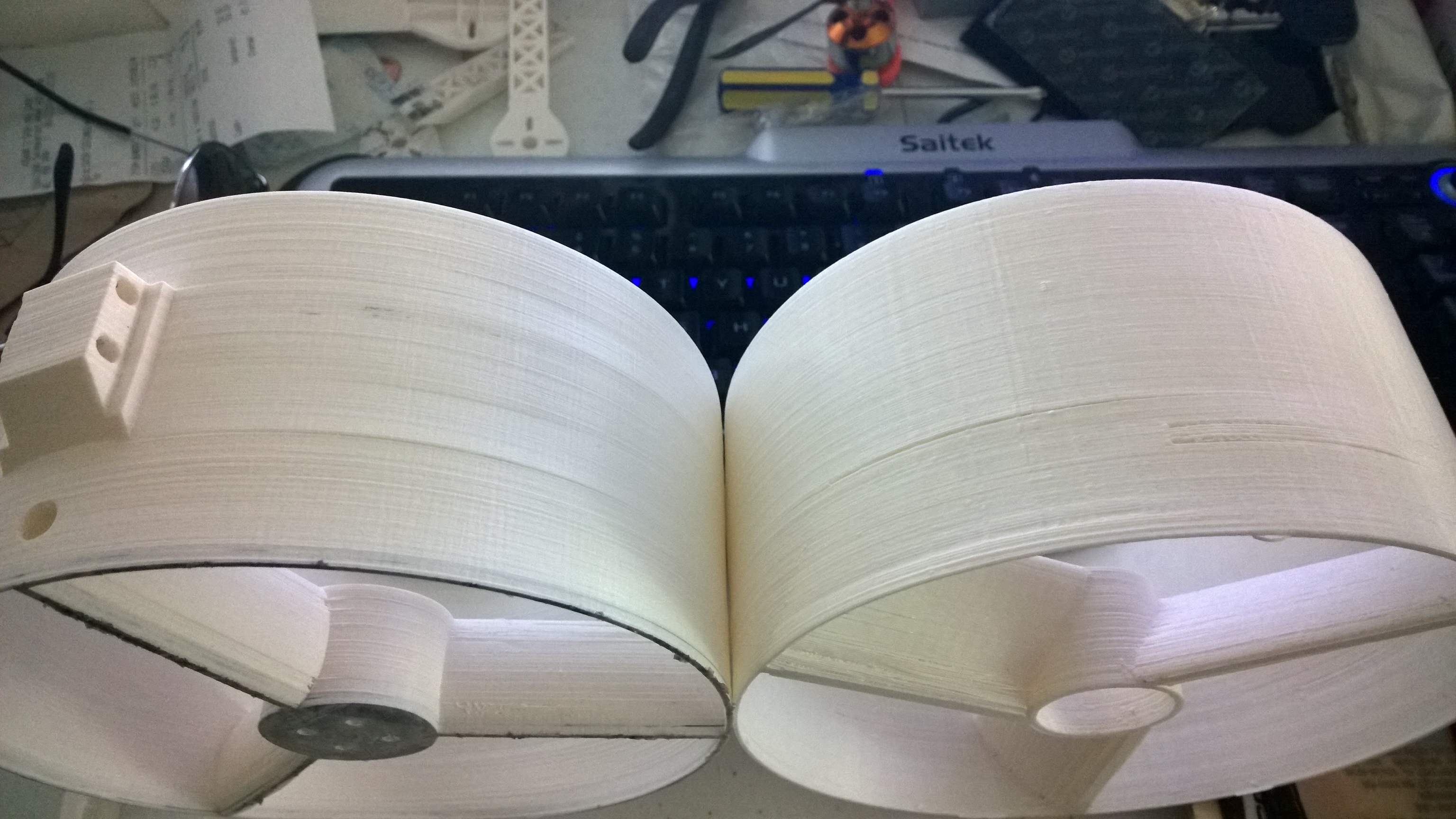 The object on left had some areas of weak layer bonding that broke when I was messing around with it after it was done printing, but only next to the mounting point, whereas the object on the right had layers unbond during cooling that go nearly all the way around the objects circumference.