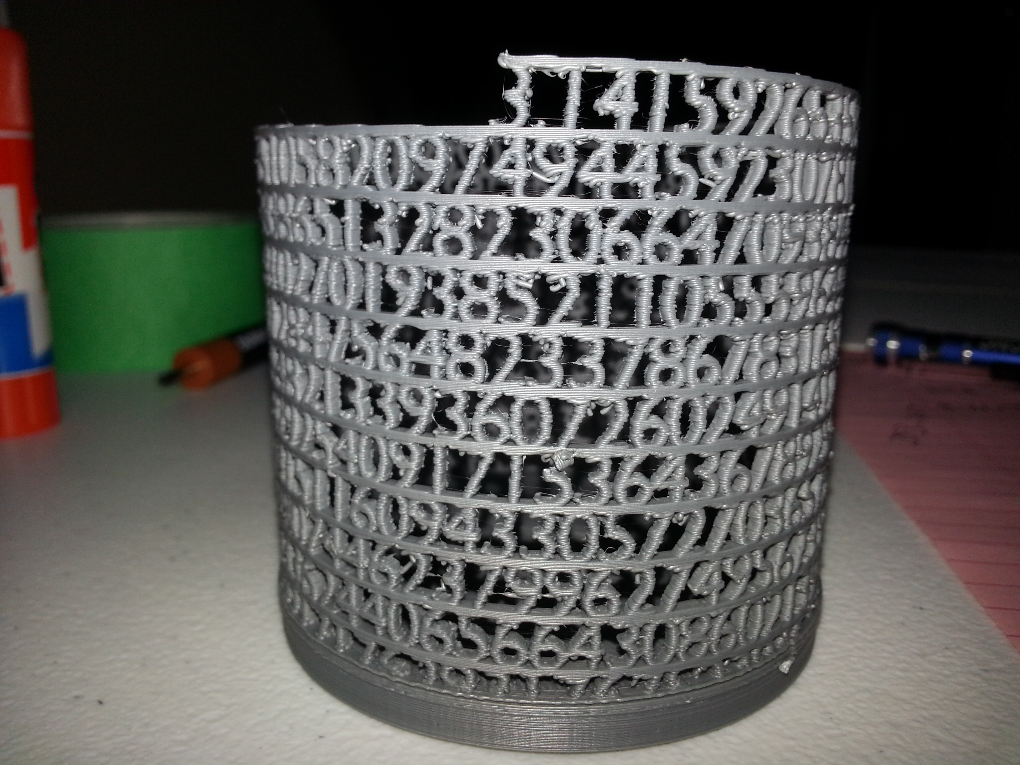 Here are a few of the things that are first off my new Rostock2 (now called the Starfleet Replicator). The first print was a small calibration cube. The second was a 30mm plug test and the latest print was my attempt at the short version of the Tower of Pi. Used ABS on all.