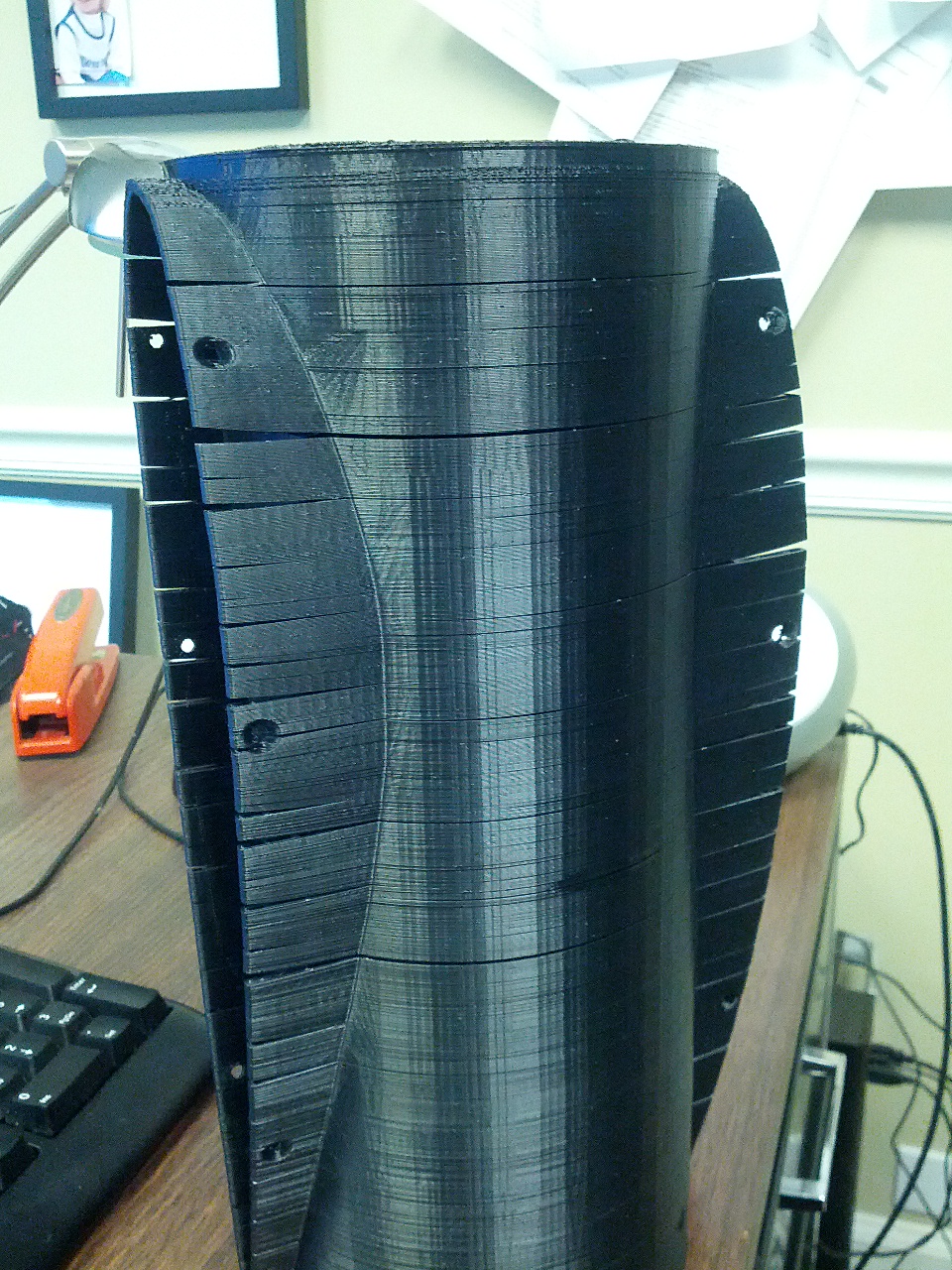 I'm just starting my initial experimentation with printing on my Rostock and I have to say I'm extremely impressed with it. On the friday before labor day I started my third print on it which was a 51 hour print of a center fuselage section for an RC aircraft I'm designing. I started the print and when I came back to work the next tuesday it had finished! There were tons of layer separation issues but I was still pretty impressed.
