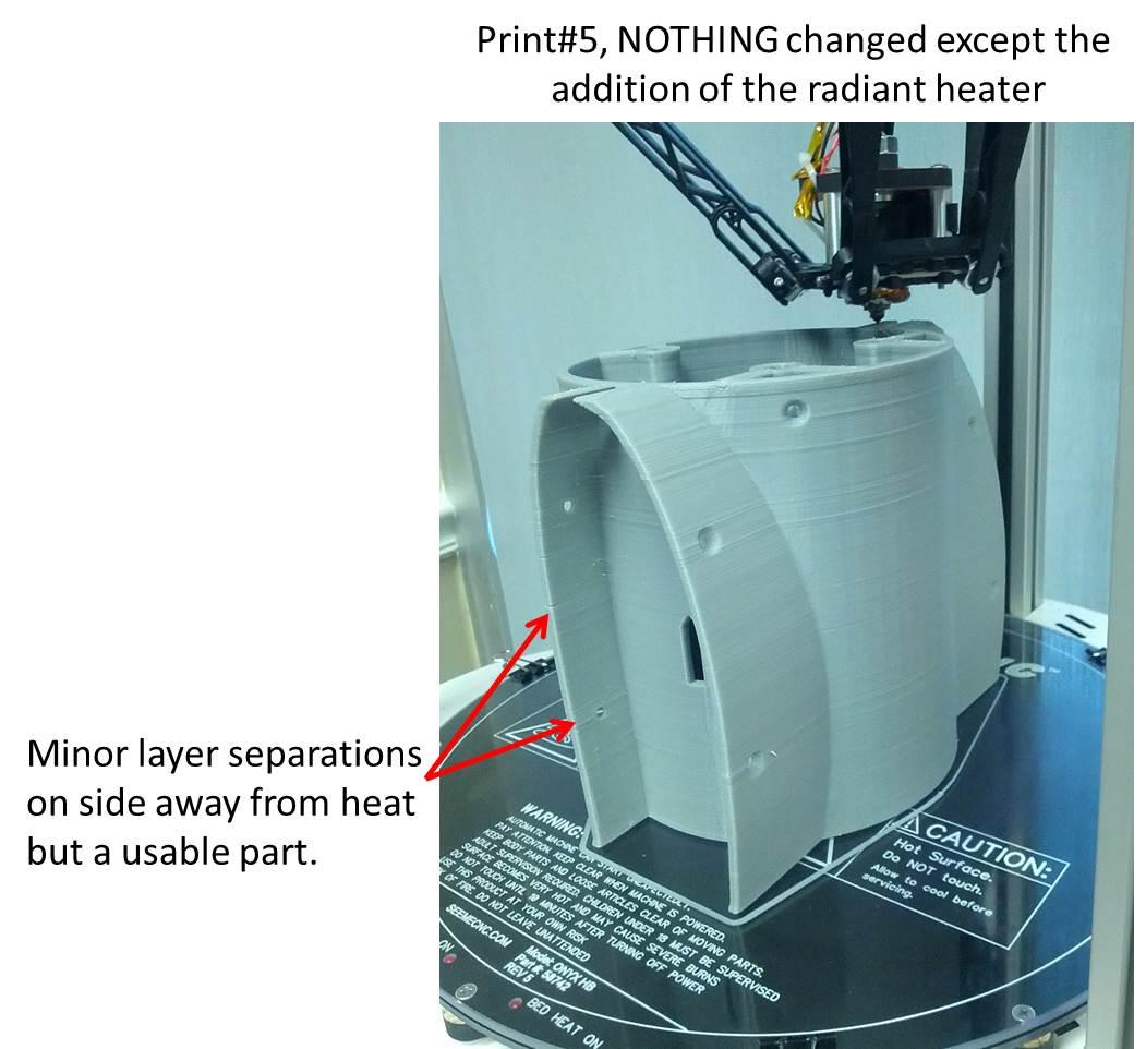 I figured that a heated enclosure would help but didn't really feel like building a big a$$ box around my Rostock so I thought I'd heat the part in the build volume via simple thermal radiation. I did some horrible things to a parabolic radiant space heater so I could tilt it and CHANGING NOTHING I hit print on the same part.
