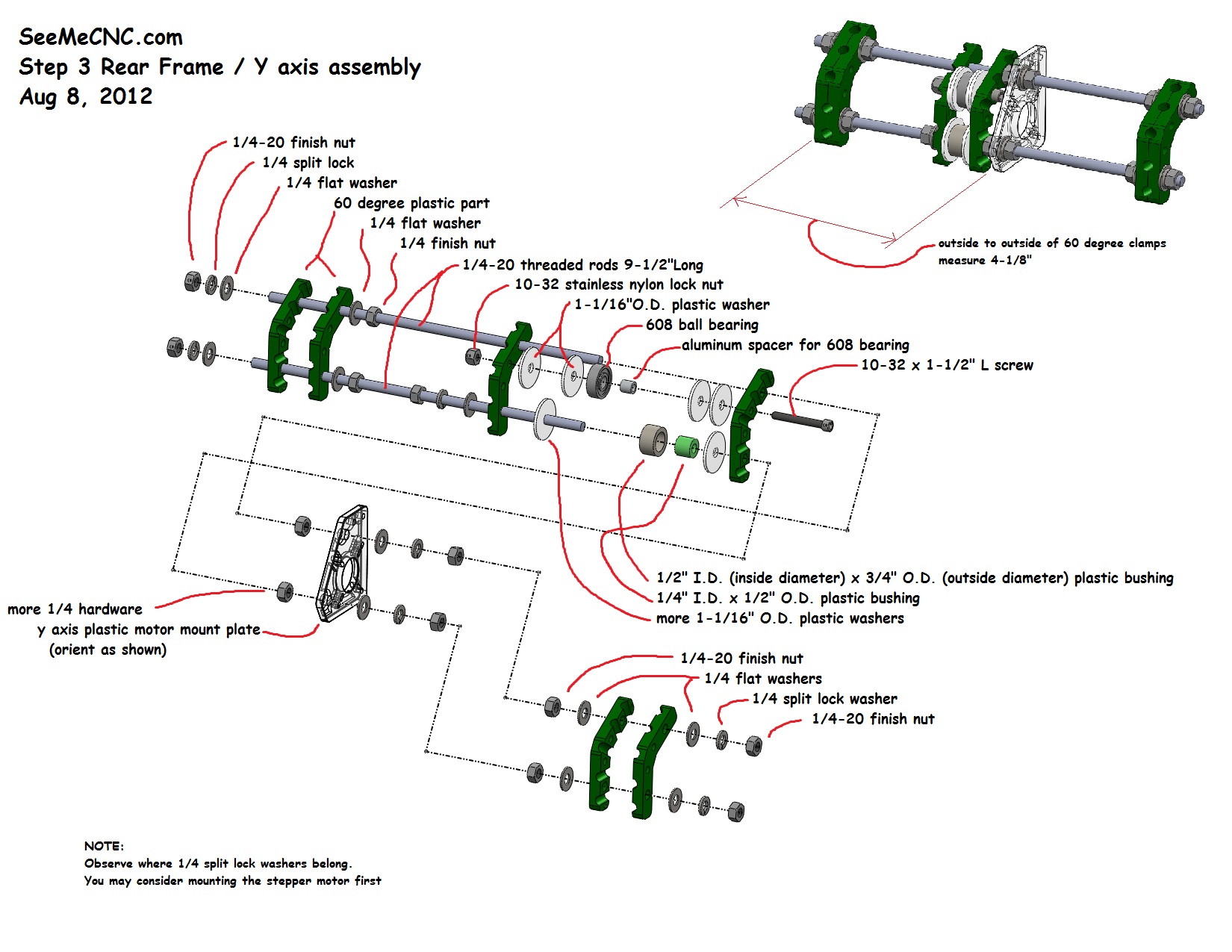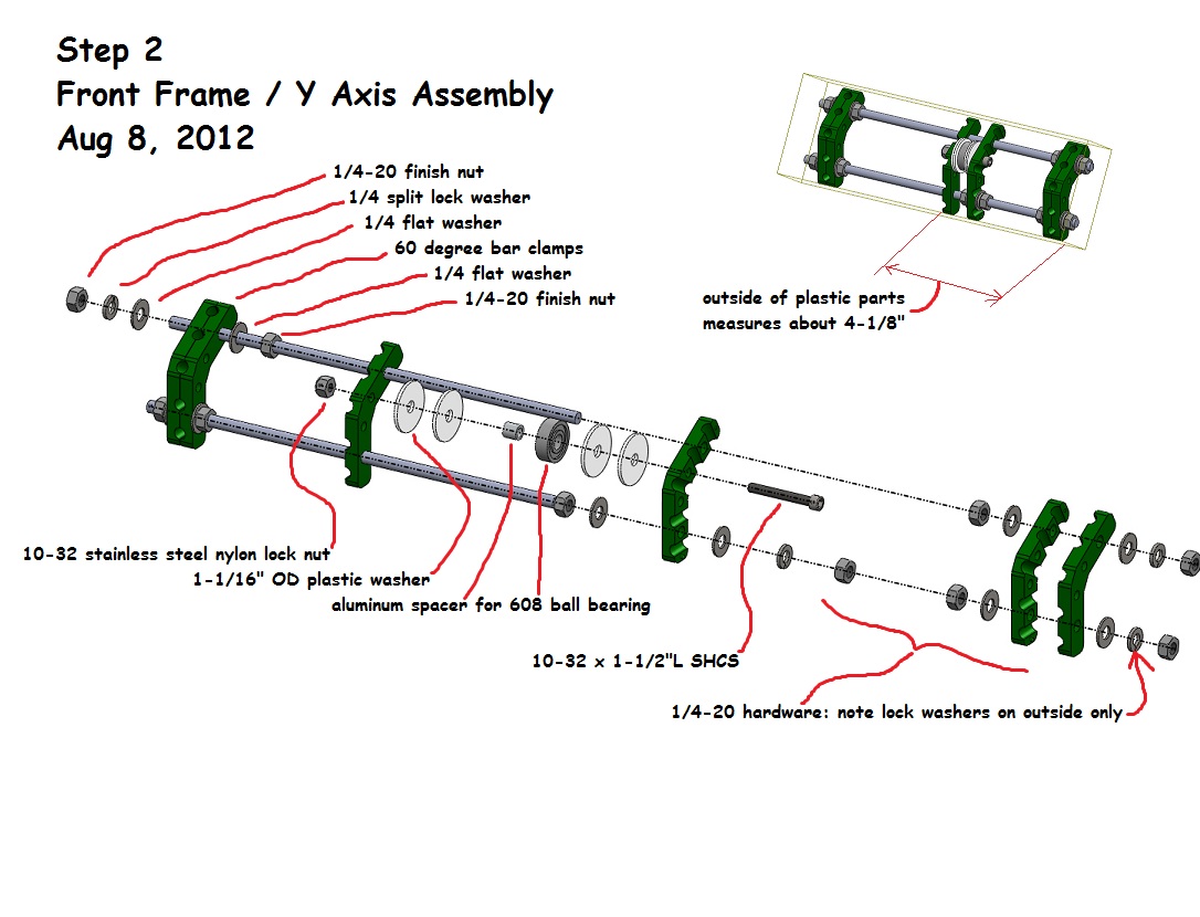 Starting with the base of the machine. Orient parts as shown. The #6 x 1 sheet metal screws hold together cross bar clamps. All threaded rods are 1/4-20 x 12"L. R4ZZ ball bearing held in by #6 x 1/2" sheet metal screws and will require one drop of super glue from the bottom side to secure them.