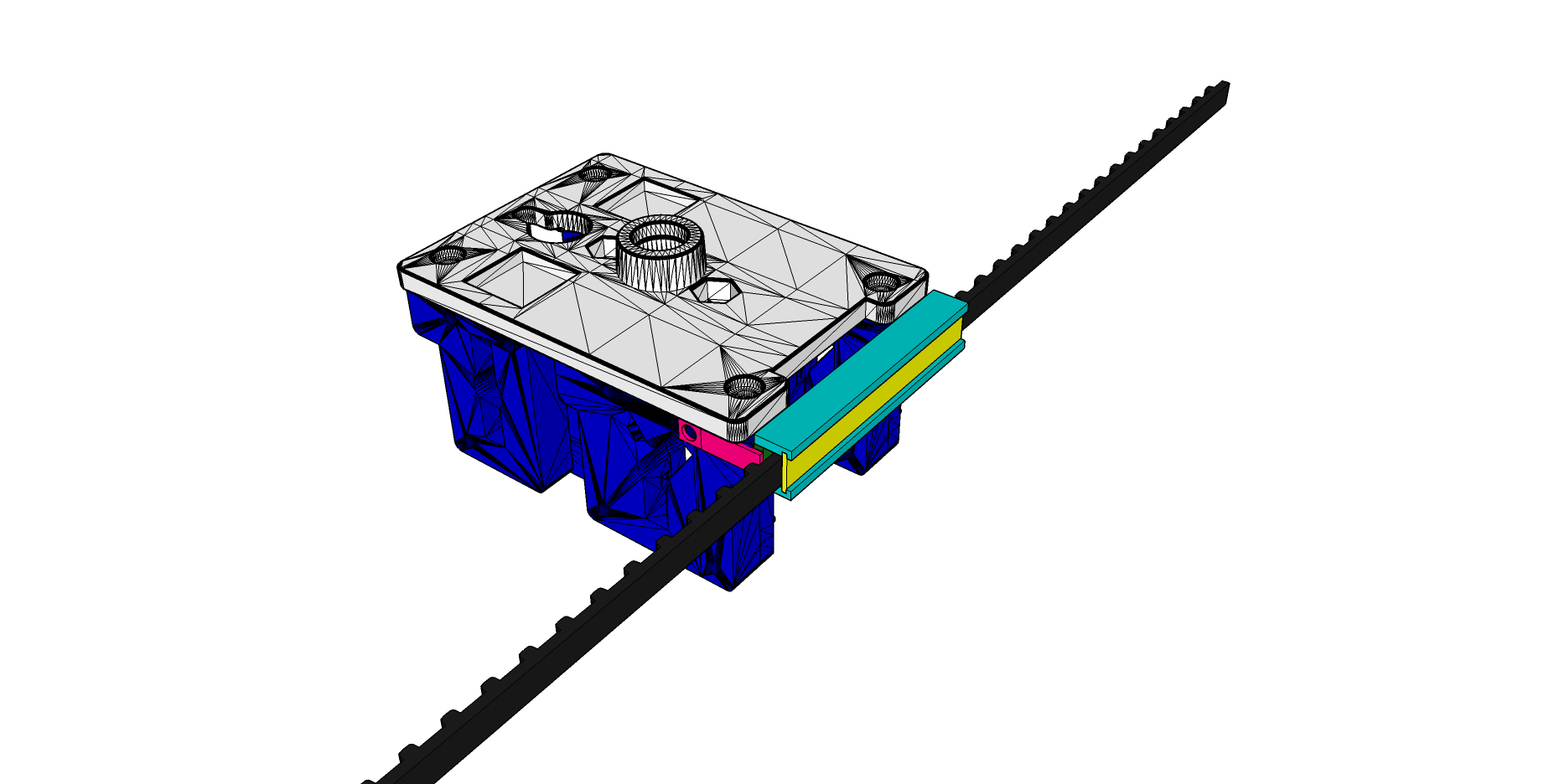 The 2 green parts are glued together, then the 2 blue sides are added. The Yellow part slides in to keep the timing belt in place. Im thinking to add a nut/screw in the center to keep the yellow slider from coming off during operation.