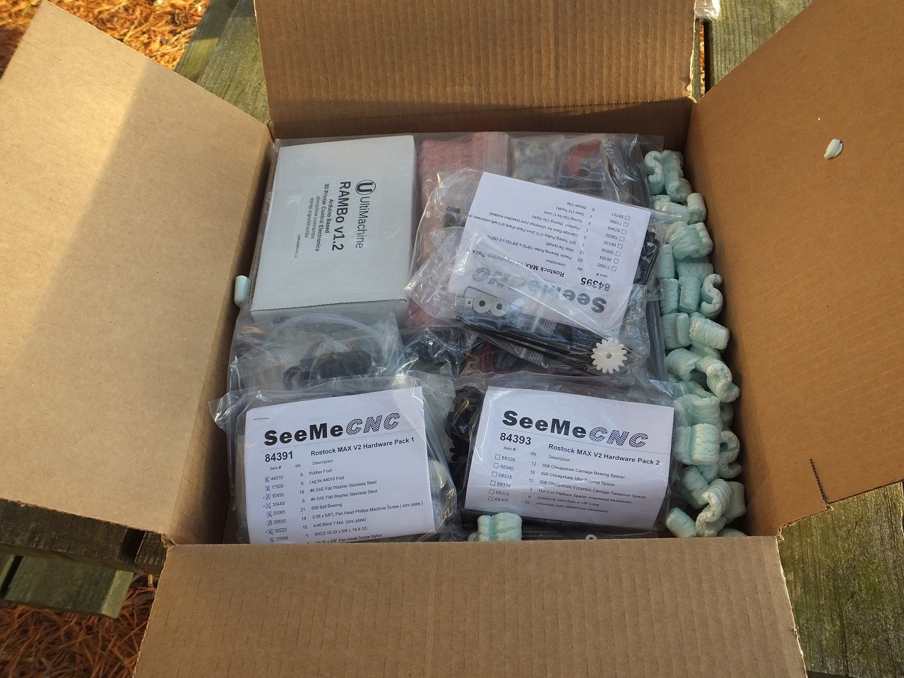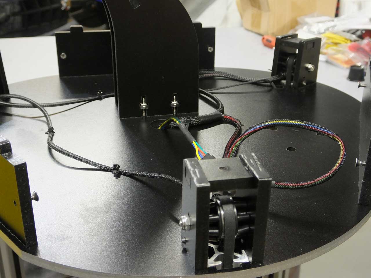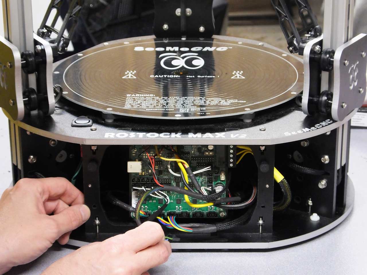 Here's a couple of pictures of our Rostock Max V2, showing the finished printer. We spent the extra time to get the printer built as neatly as practical, and did our own custom color scheme for the melamine parts to bring out the exterior edges with silver accents and black on all interior edges so that the internals and the visible tab edges were not the burnt laser cut color. Painting the edges also takes away the burning leaves smell that the parts gave off. We think it turned out even better than we expected.