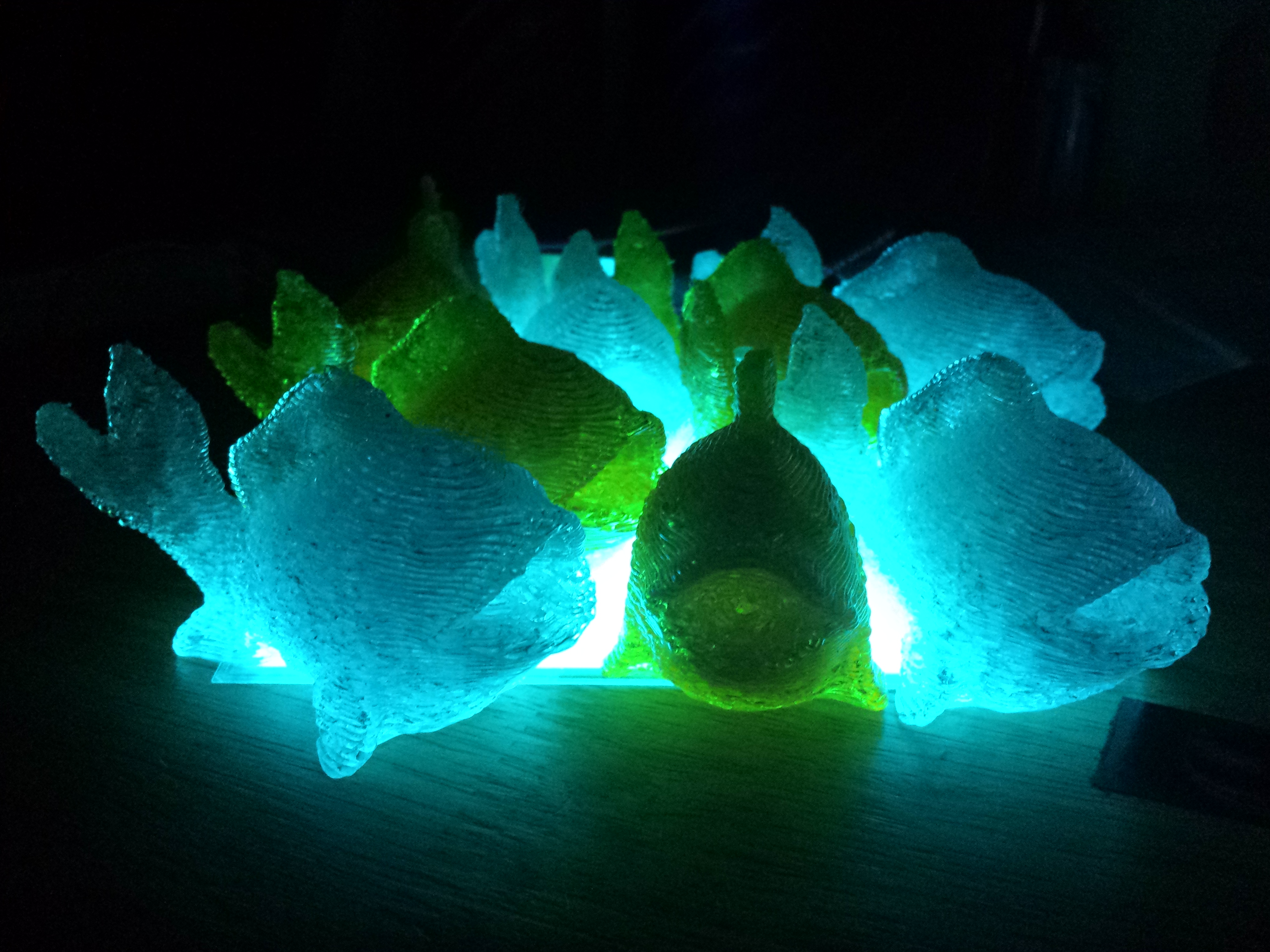 I printed some "concrete fish" from thingiverse from PETG and placed them on an EL panel to photograph them. One color is Inland gold, the other is Inland clear. This is cheap filament, less than $19 (USD) per 1kg roll.