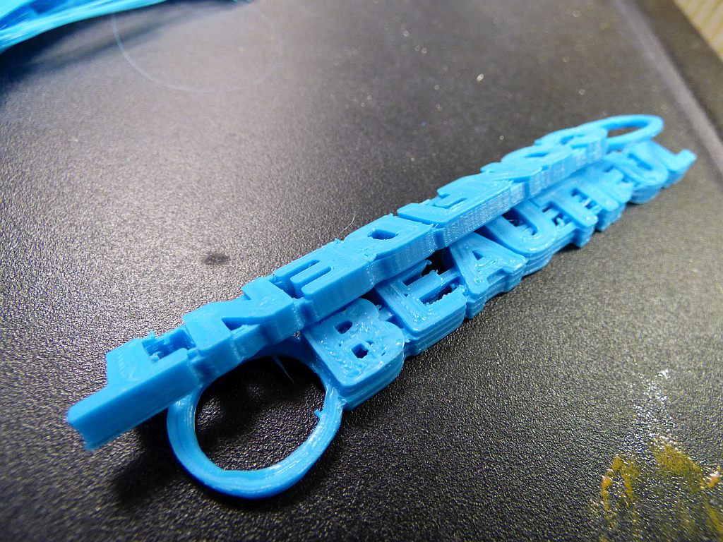The second problem can be seen in the photo of the bottom of the print of the word "BEAUTIFUL." We get this a lot and have for quite some time now. There does not seem to be good bonding between rows of filament laid down on the first layer. This is exacerbated when on the inside of a large-radius curve. It seems as if the outside shell is shrinking before the next strand has a chance to bond with it, leaving a gap. There are often gaps in the filament on the first layer and these then are repeated in subsequent layers.