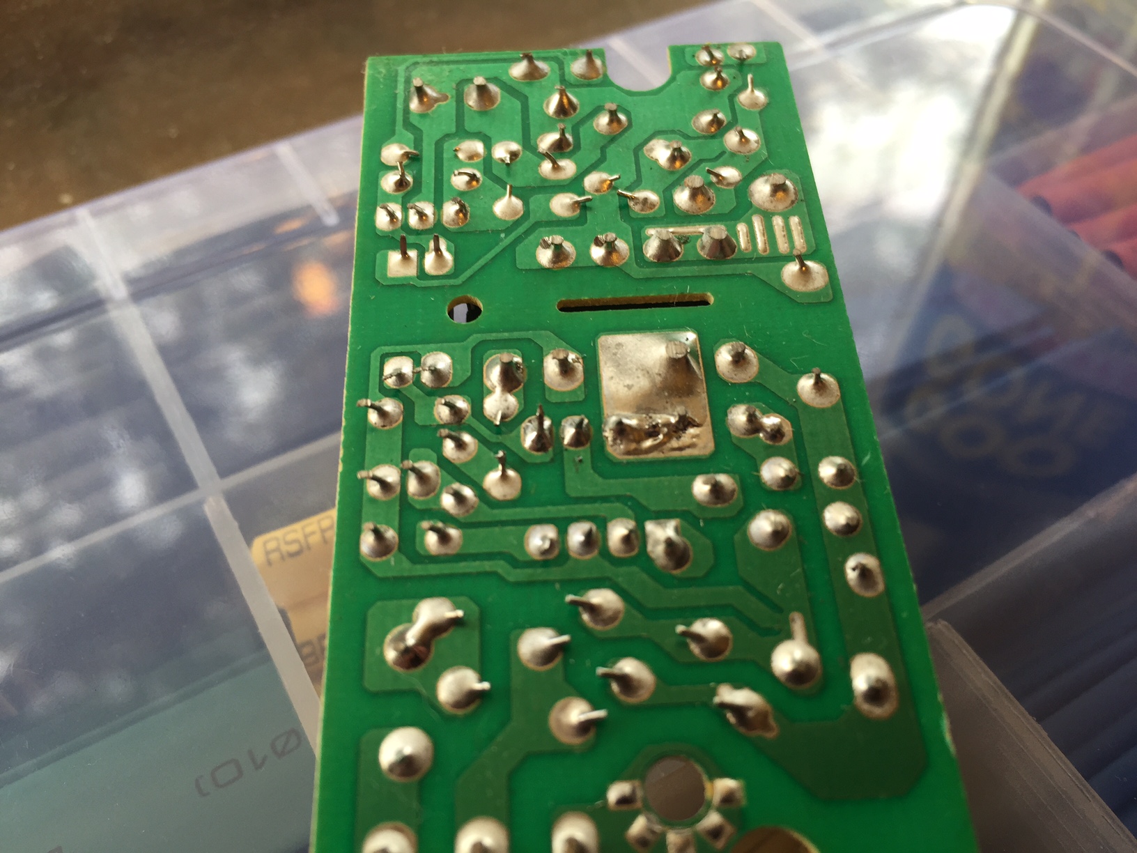 They did _just_ enough quality control to catch that the board was dead, and reworked the board _just_ enough to get it working. Note the bottom of the big solder rectangle in the 2nd image, that's immediately under the high end of the tilted IC. It's been kissed _just_ enough to get it making contact. They didn't bother actually reflowing the IC properly flat. So while it did supply 5.2xx volts when plugged in, I was deeply suspicious. Suspicions confirmed when I tried to trim it down a little to hit 5v even. Nope. Second the output dropped under 5.2v it lost its tiny little mind, voltage jumping around all over the place. Regulated my arse.