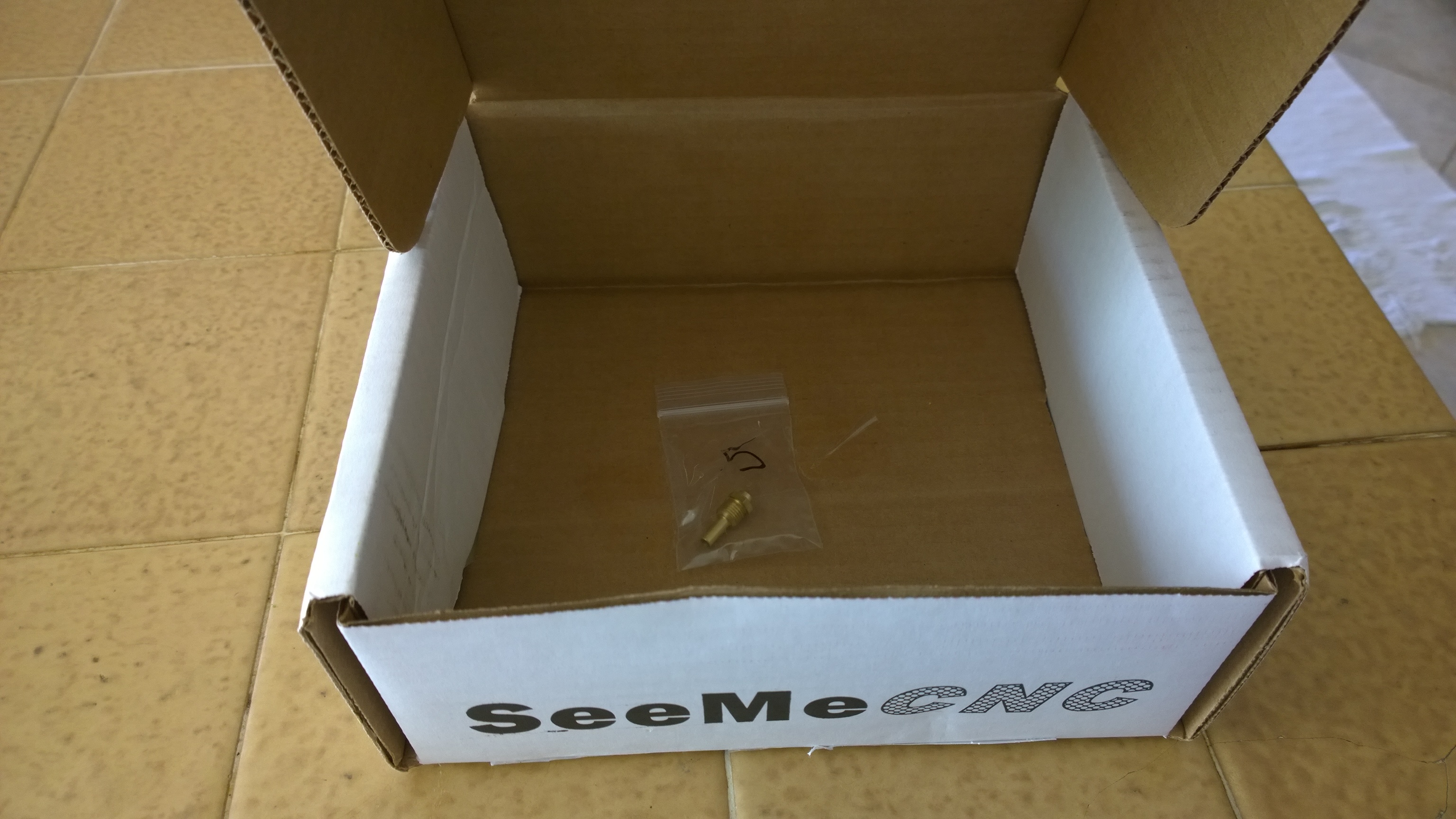The original nozzle became clogged on my Rostock Max 2. Replacing it was very straight forward: Order new nozzle ( http://forum.seemecnc.com/viewtopic.php?f=59&t=6069 ) Drop two arms into transport position. Heat hot end to 240. Use 3/8 in wrench to remove nozzle. Cool hot end. Install new nozzle ...