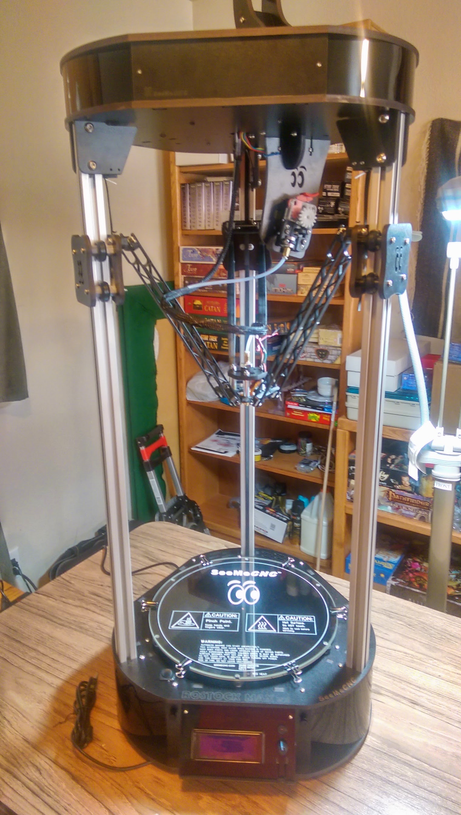 Howdy all, Playing with OctoPrint and Rostock Max v2. I've had it assembled for a little under a week and I must say the machine and the tools are incredibly easy to setup. Printing the top of a case for my Raspberry Pi 2 that is currently controlling the printer. <<print is completed - redacted ...