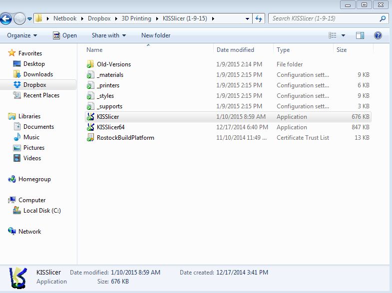 Now whenever you launch KISSlicer it will launch from your local dropbox folder and all configs will be saved there as well. It will then automatically update the .ini's across all machines so that you never have to sync them manually again.