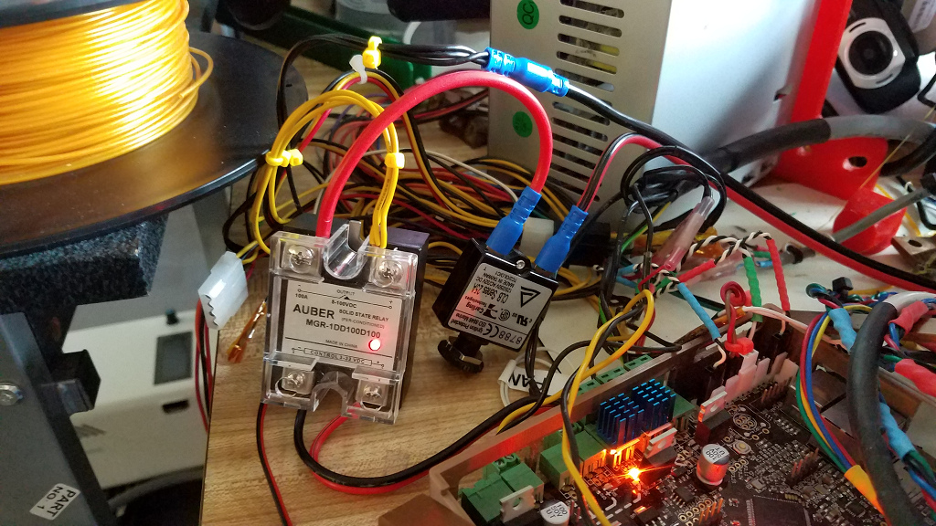 • Power MOSFET on the controller, or external solid-state relay (SSR), "fails open," causing partial or full power delivery, even though the controller has commanded it to shut down. This can happen any time the heater is energized, whether or not you are messing with the PID settings. A thermal fuse is one way to compensate for this. If your power supply is capable of accepting a "shutdown signal", your controller and firmware may have a facility for triggering that - look in the documentation. (ATX power supplies may be able to do this. LED-style power supplies can't.) Alternately, it should be possible to fit an external DC SSR that controls voltage to ALL the heaters, assuming your board's microcontroller is fed separately from the heater power. That's pretty common. If your board can let you have 24V heaters, then the power is fed separately. I know Smoothieboards are like this, and I'm pretty sure the Duet and RAMBo are like this as well. The firmware would have to have thermal runaway code that sets the SSR's pin high when the system is in a normal state, to enable the heaters, and it would have to take the pin low if it detected a thermal runaway. I don't know which firmware does and doesn't do this. If you do, post about it!