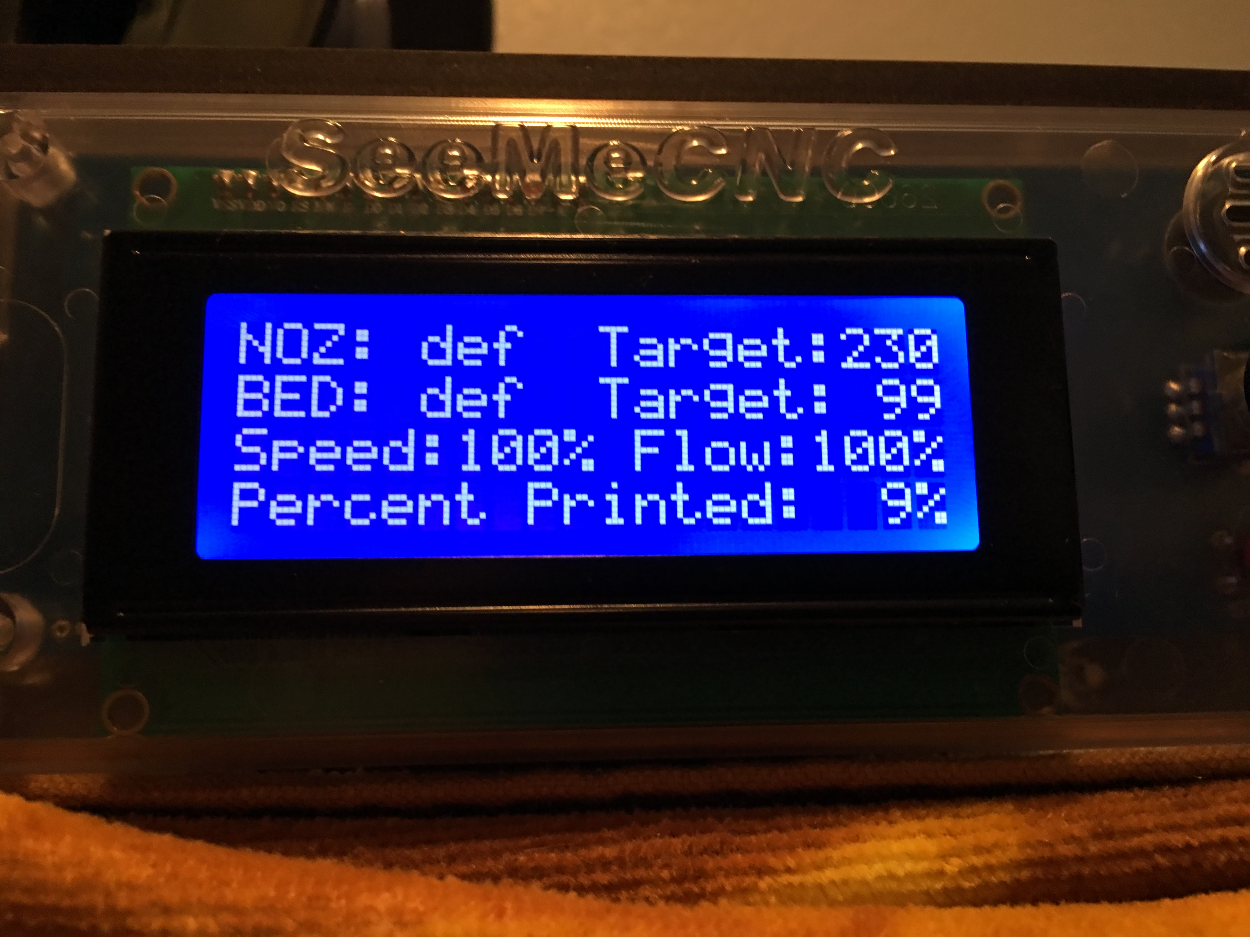 I've been frustrated as I cannot resolve this no matter what I try. While printing, after about a half inch in layer height, the LCD will read "def def" for the nozzle and bed.