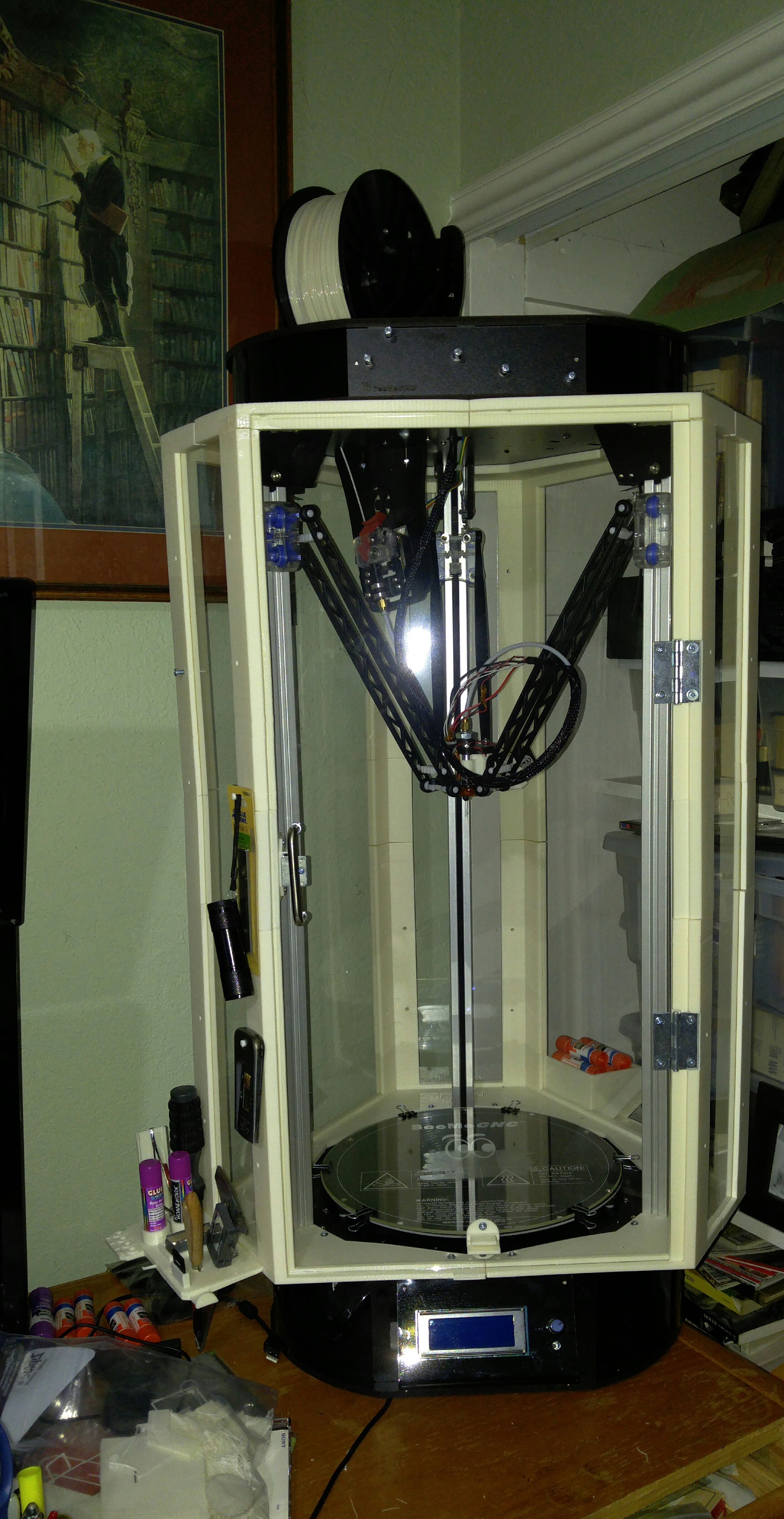 Let's see, so far I've printed a frame for a plexiglass enclosure, attached a tool holder, spare gluestick container, camera and pi container to the frame, installed an e3d v6, made a belted extruder, a filament container to keep my Taulman Bridge dry (I'm just about to finish my own remix), and about to install the accelerometer, as soon as I finish printing the mount for my hotend. I also got Simplify3d, which does have one or 2 minor flaws, but is still my favorite slicer so far.