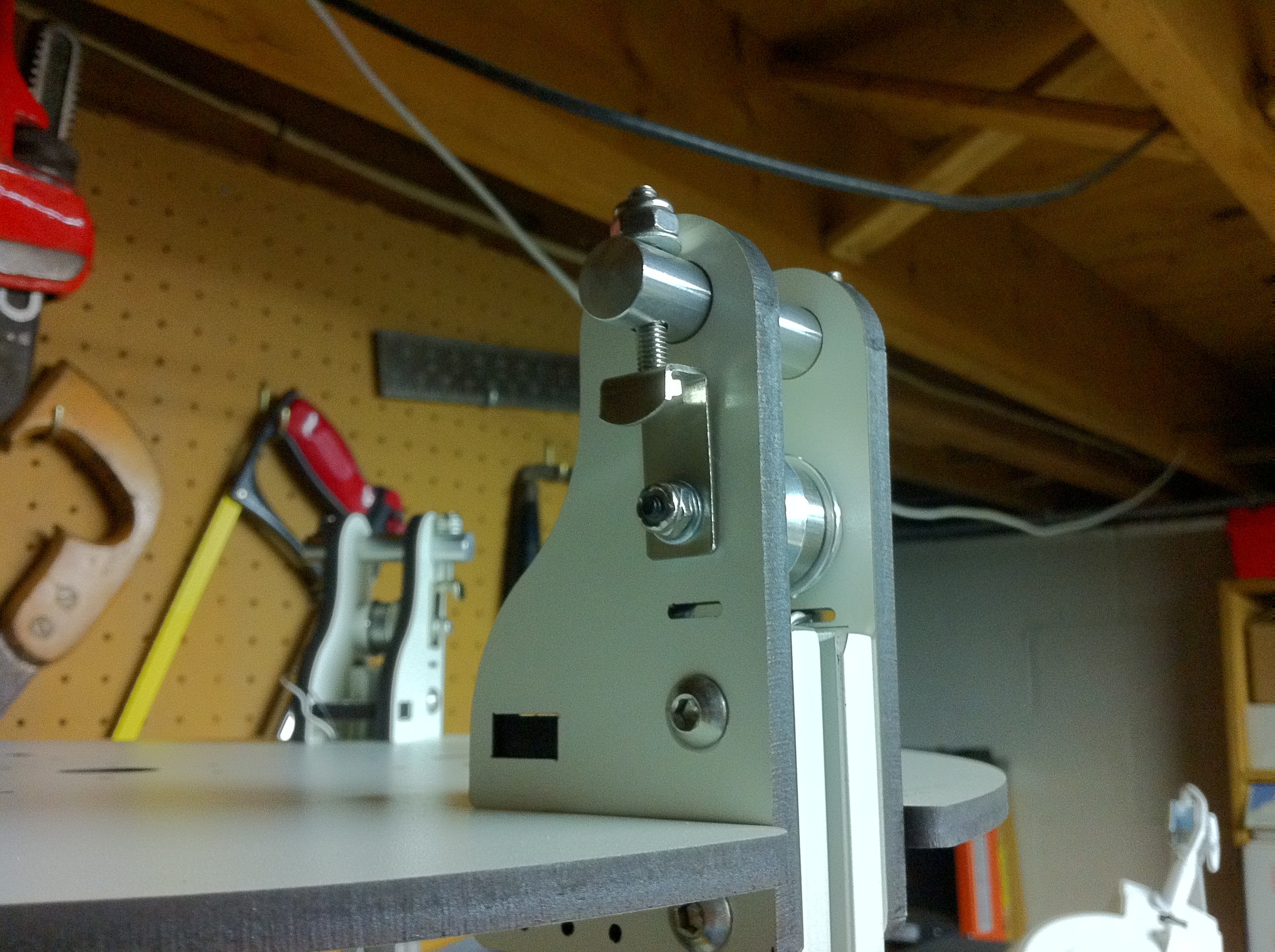 So, this is what I ended up with. I drilled the holes in the crosspiece far enough out to let me put a nutdriver on the nuts, so the vertical bits had a bit of an angle once the screw through the idler was tight. I added fender washers to keep these parts vertical, and to spread out the load to avoid crushing the wood when I tightened the screws.