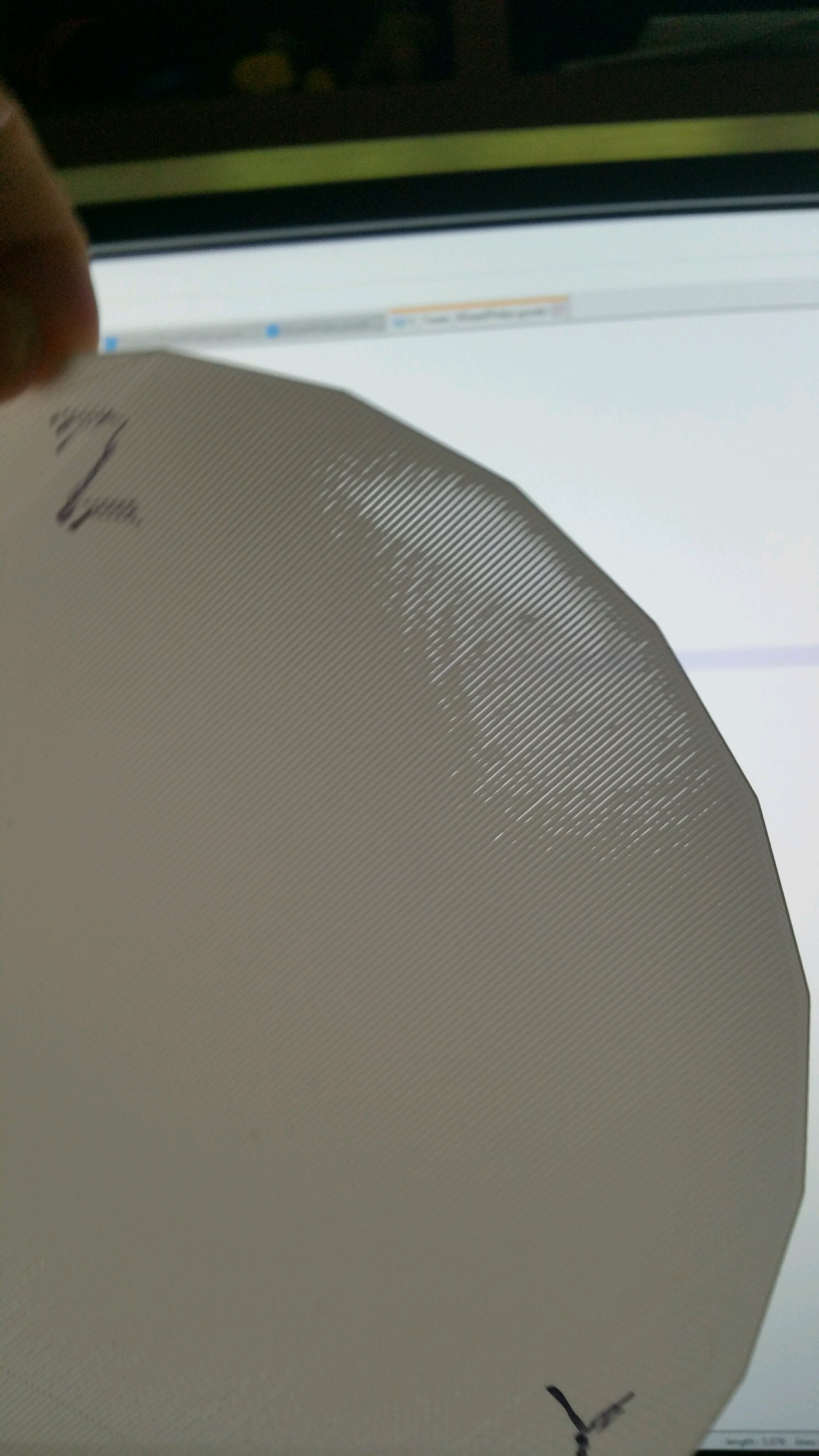 I can see the rough spot, it looks to be an area on your glass that maybe wasn't clean enough. I've noticed when that happens the plastic tends to bubble up in that area due to bad adhesion to the glass. Not sure though. All in all, your test print looks really good from what I can see from the picture. A question though, I think I remember you from another post, weren't you just having an issue where you were too low just between the Y and Z tower at the outer perimeter but fine between the other towers? Seems like that would just be fixed with the proper tower rotation. either way I'm curious to compare dimensions between us for standard steps and poor calibration and modified steps and low deviation calibration. ***EDIT*** I see you updated your photos. That looks like your nozzle was too high in those areas.