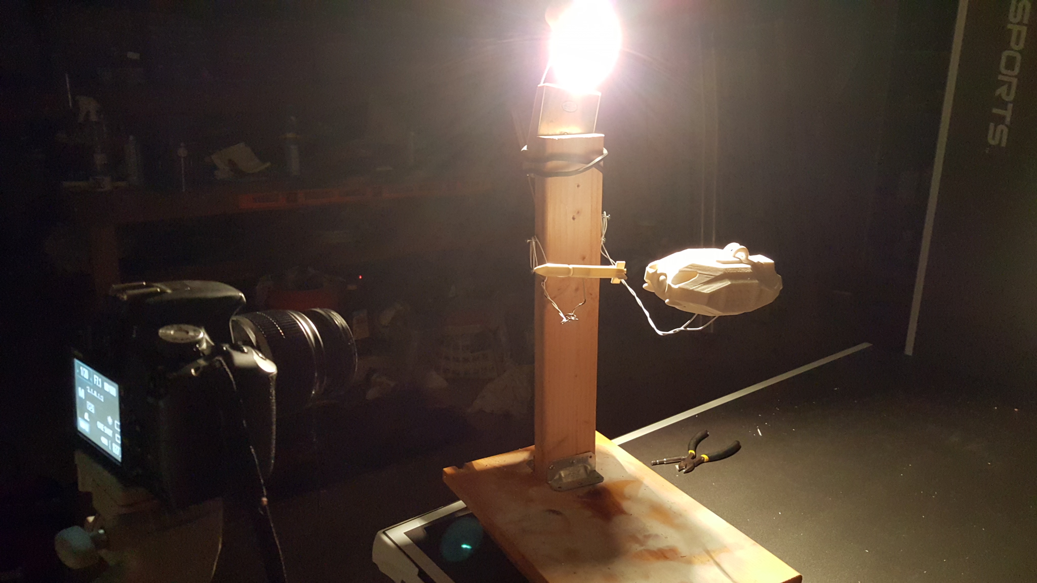 Two pieces of wood and two hapless coat hangers later, a ladder, and a light, and I'm ready to test out the mechanics of the scene I have in my head (missile coming slightly at you, angled tilt, planet horizon in the background).