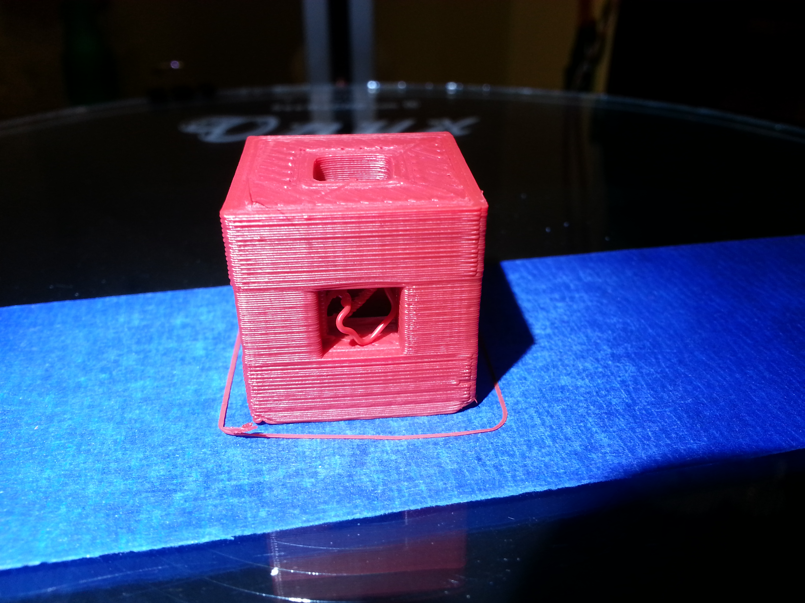 I'm still a long ways from getting really great prints off of it but things are looking promising. The only real snag I ran into was getting my abs plastic to stick to my glass build plate. I tried several different kinds of hair spray, and then tried blue tape, I eventually got one print to kinda sorta stick so I let it finish printing. I will need to investigate this further, and find a more reliable method.