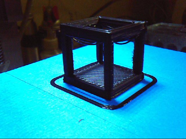 I am running the hollow cube right now and have had a few surprising results. After the statements on A axis tuning speeds, I sped all of my axis up till stalling (huge offsets in the cube). I then lowered them by about 1/3. The results are much better. My A axis has a velocity of 1600 at the moment, IIUC this is a retraction speed of 26mm/sec. It is definitely moving. I am getting no stringing to speak of. The columns are straight though the infamous blob (though very small) is still affecting the the NE & NW corners (columns in this case). I also noticed on my first print of this cube my bridging speeds were also too slow due to my maximum velocity setting within Mach. Hopefully my new tuning will allow faster bridging and less sag. My present attainable speeds should be right in the 100mm/sec range. I am also finding the only way I get good adhesion to the bed and uniformity is to run a single "post it note" (.04mm-.06mm) for clearance. This gets the seemingly correct amount of squish into the filament. Other's experiences in nozzle heights of the bed at start up would be great.