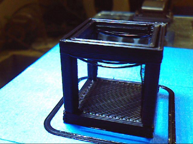 I am running the hollow cube right now and have had a few surprising results. After the statements on A axis tuning speeds, I sped all of my axis up till stalling (huge offsets in the cube). I then lowered them by about 1/3. The results are much better. My A axis has a velocity of 1600 at the moment, IIUC this is a retraction speed of 26mm/sec. It is definitely moving. I am getting no stringing to speak of. The columns are straight though the infamous blob (though very small) is still affecting the the NE & NW corners (columns in this case). I also noticed on my first print of this cube my bridging speeds were also too slow due to my maximum velocity setting within Mach. Hopefully my new tuning will allow faster bridging and less sag. My present attainable speeds should be right in the 100mm/sec range. I am also finding the only way I get good adhesion to the bed and uniformity is to run a single "post it note" (.04mm-.06mm) for clearance. This gets the seemingly correct amount of squish into the filament. Other's experiences in nozzle heights of the bed at start up would be great.