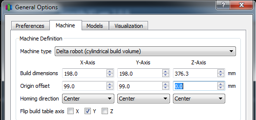 Anyway, these are the parameters I have for my Rostock Max; they seem to work fine. Before that, using X=Y=260 my large prints were caught "out of the bed". No good for the belts, they got bitten by the pulleys when the Cheapskates fell down hard!!! Here are the parameters that *should* work with Orion. I DO NOT own an Orion, so, I hadn't tested this values, so please, use caution the first time you go to the edges of X or Y. PS. The Z value, of course, depends on your actual height. I guess it is always the same value for Orions.