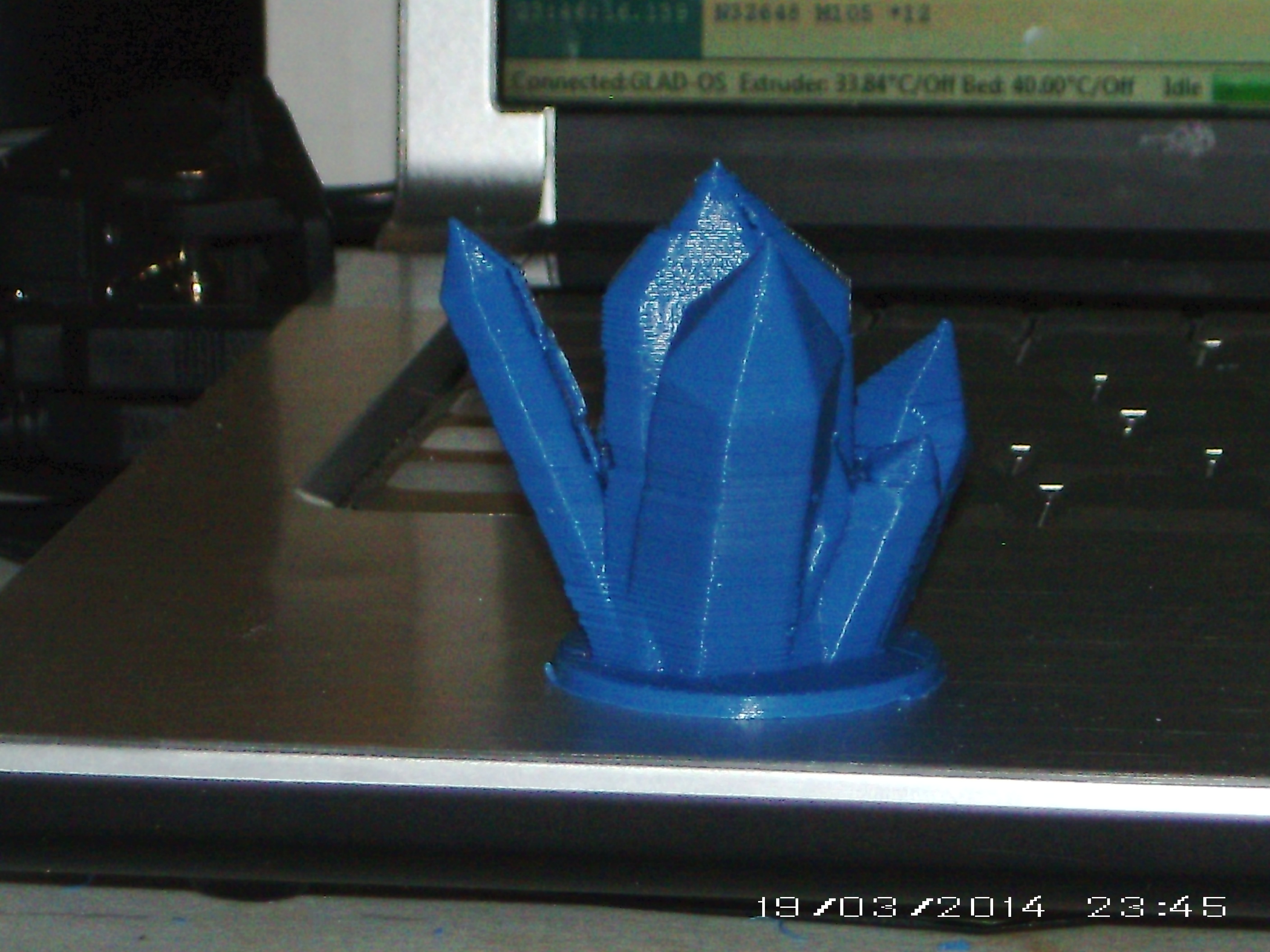 Well the wall finished, it has a line across the middle with very little plastic, and it actually broke in half long ways when I took it off the plate, easy to glue back together though. and it looks stringy.. The crystals worked pretty well for the first 30 or so layers, then one of the back ones is shifted about .5mm to the right, but went back to the original position near the top, and as it went up more of the smaller crystals were shifted to the right, but not all of them. I would have thought the whole model would have shifted of one of the pulleys slipped.
