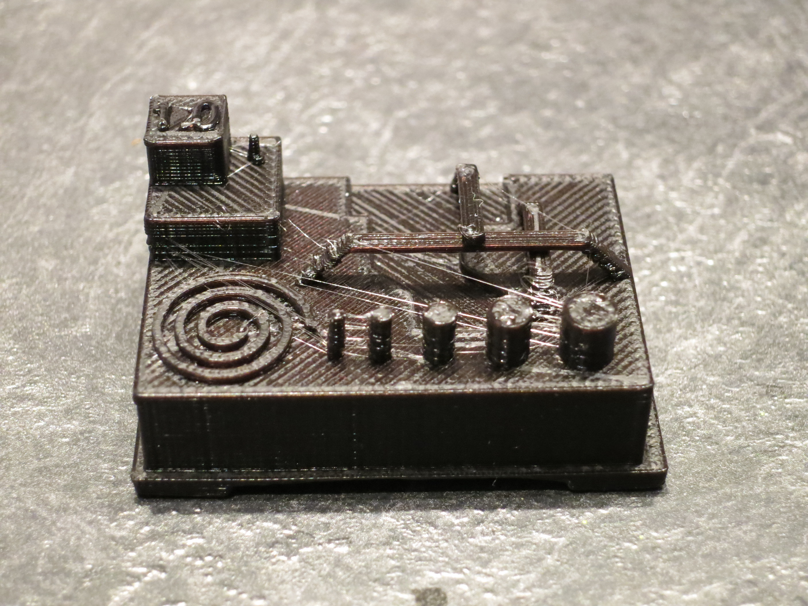 With Slic3r, it at least tried to print everything (except the '.' in the 1.0). It got the back wall and the tiny cylinder on the first square block. The spiral pattern was nice and crisp and the walls were good and thin. The pillars leading to the bridge were excellent and the bridge was so-so. A bit of sag on the first span then the rest went pretty straight. The row of cylinders turned out pretty decent as well. As with KISS, there was a bit of gap in some areas between the outer perimeter and the inner, but it seemed to be primarily isolated to the larger square.