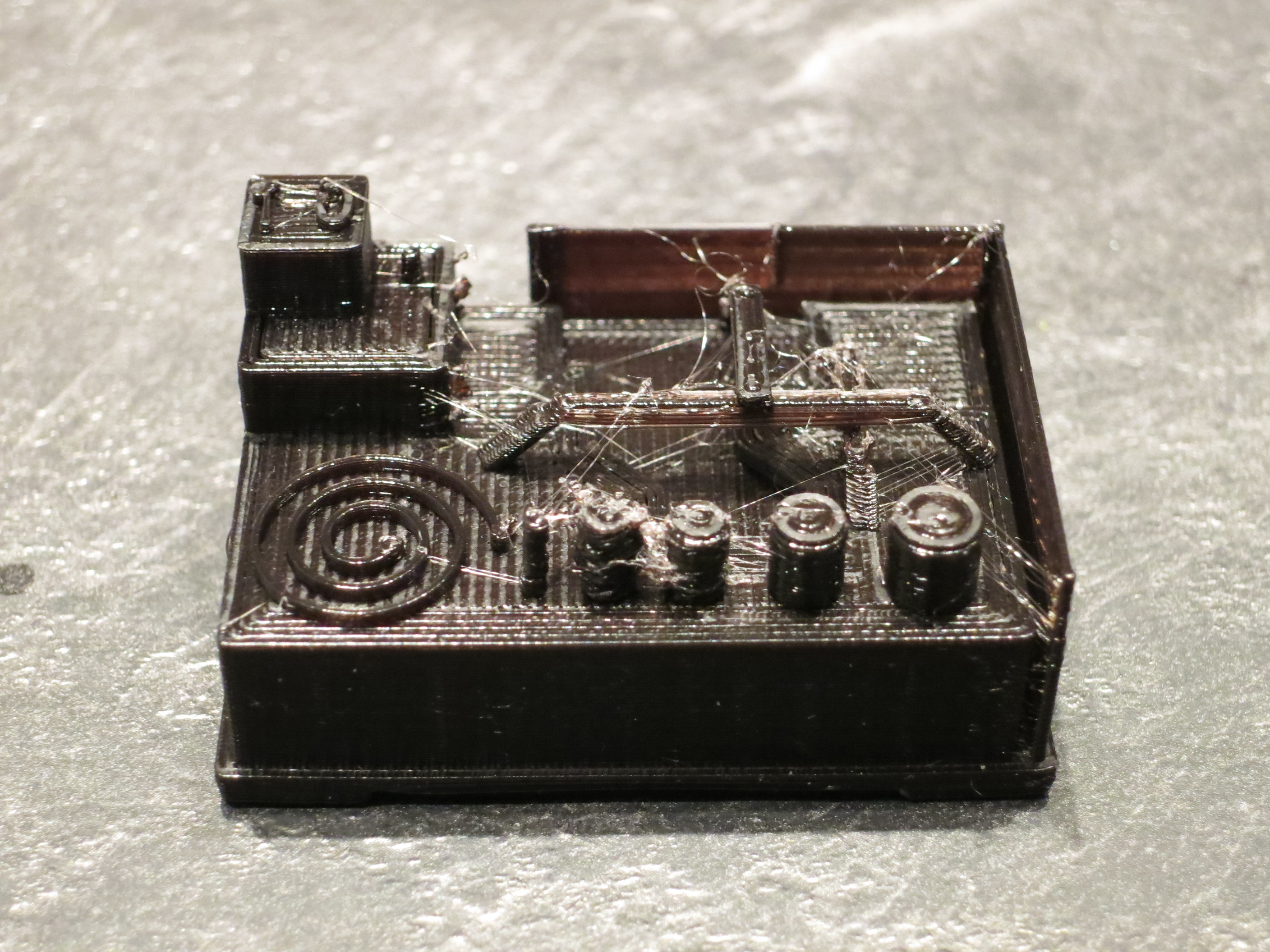 This one actually turned out very nicely. No gaps, the numbering on top was complete, the cylinders had no holes or anything, the bridge was MUCH cleaner. It even printed the tiny cylinder just below to the right of the '1.0' which was missed completely by KISS. However... it decided to leave out the thin wall along the back and side completely. I suspect that maybe the software decided it was too thin? Whether it be the extrusion width setting or the nozzle size, I'm not too sure yet.