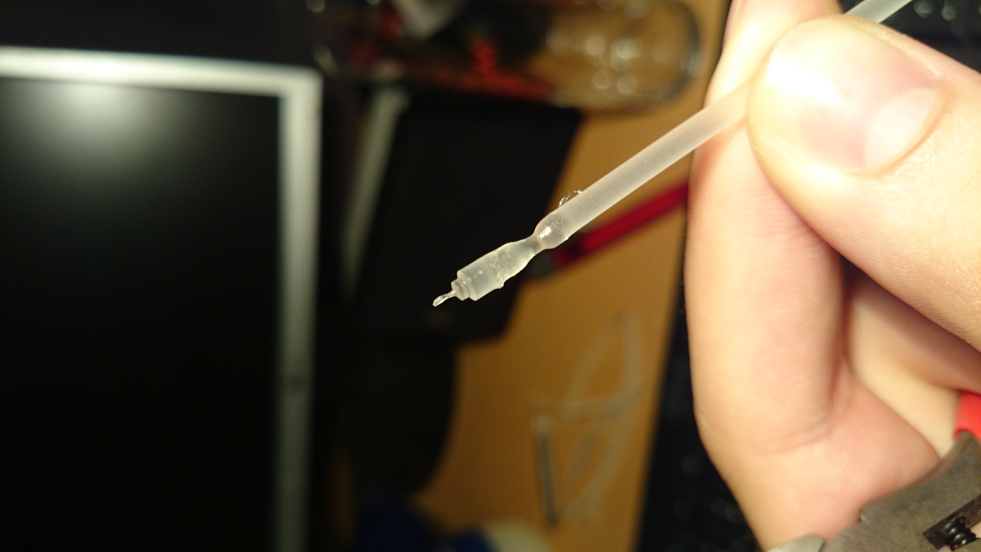 Then I grabbed a 2mm drill bit and tried to dig down another 1 mm into the nozzle, reducing the bore to about half its original size. After trying to do this, i've re-measured using the vaseline method. The tip of removed PLA probably strechted a bit, BUT: I quite accuratly removed 1mm of the bore. You can see the beatifull 2-staged rocket that is my rocket now.