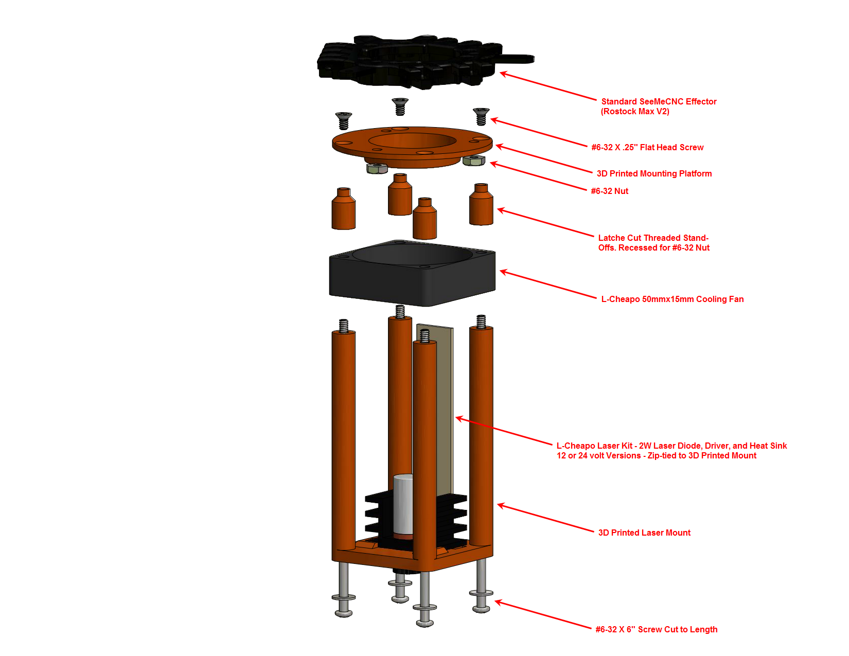 heathenx wrote:Alright, here's what I have so far for the laser. I printed the thing out of PLA so it would be stiff. You want as little flex or vibration in the mount as possible. Especially so since this is a long mount. This particular design works very well. It's quite rigid when assembled. The whole point of it is so I can easily add it to the underside of the effector quickly. Attaching it can be a little tricky though. I use needle-nose pliers to get two of the nuts started. Still, it only takes me a minute or two to get it on and off. The driver can be separated from the heatsink and rewired off of the mount but I chose to keep it intact.