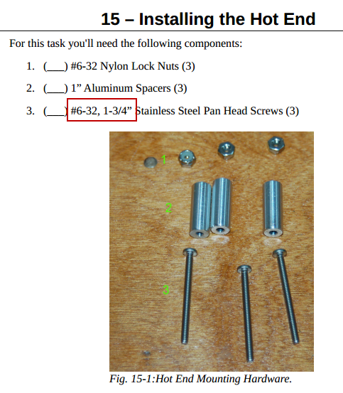 My kit came with not enough hardware in those sizes, so SeeMeCNC sent me a bag of each. That's why I was asking and brought this discrepancy in the manual to this thread.Brian wrote:BONE wrote:What length screw is to be used when assembling the hot end?
