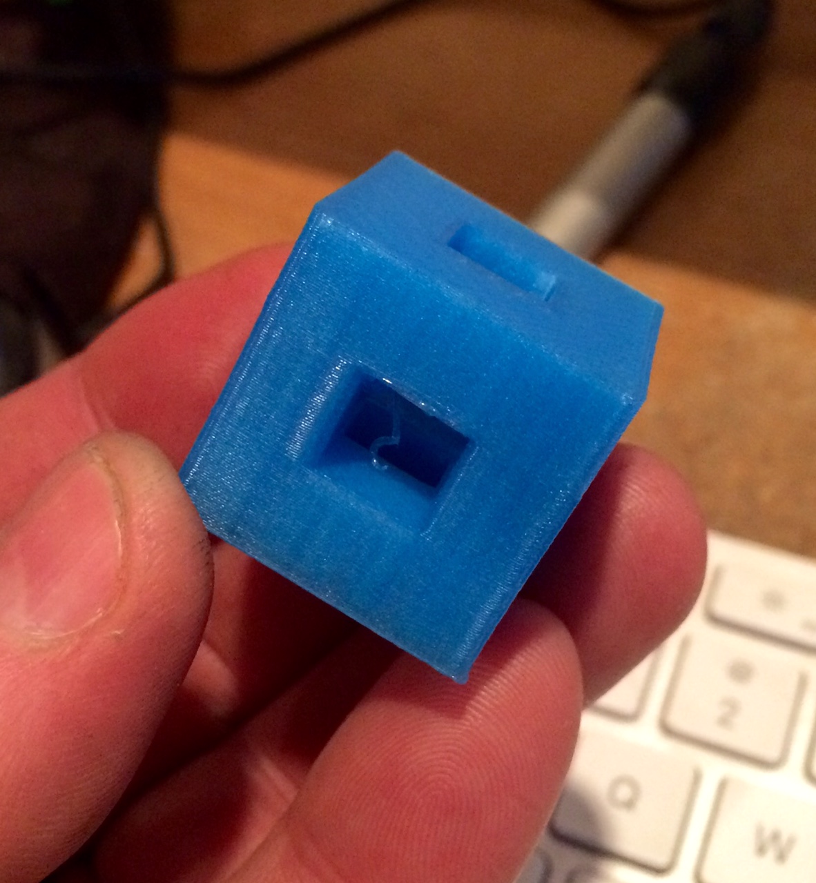 I wish I had printed a calibration cube before changing the arms. The layer registration is excellent - really pointing out that my stock arms and joints were getting a bit worn. You can click on the photo to get a bigger image that makes the layer registration more visible. This was in glow in the dark PLA and I had forgot to hook up my fan after the upgrade! So on the bridges I used a soda straw and did it the old fashioned way (blowing!). This is right off the bed with no cleanup - you can see a little filament "bridge worm" inside.