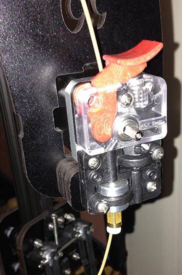 Step 12: replce the clear cover of the EZ struder, and feed in some filament, you will notice its slightly more difficult to get it in the ptfe liner, this is because of tighter tolerances, and if you have a gear or knob for the extruder, it makes life a LOT easier as you only need it to bite and you can use the knob to feed the filament.. heres me testing the feed..