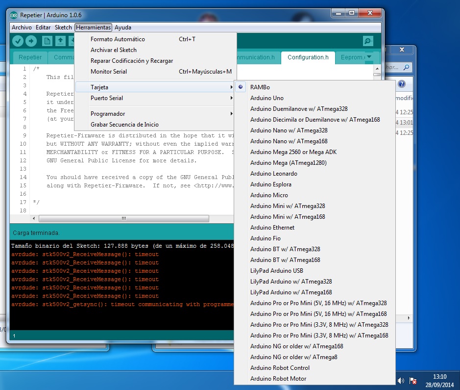 Of course I'm not conected to Repetier when I try to upgrade firmware with arduino. Arduino connects whith the board, I am sure of it, I can see with the monitor, some messages from Rambo, like restart, wait... also if y send G28 whith Arduino, Motors go up to touch the end stops, like repetier host.lightninjay wrote:Ok, this may seem trivial, but you aren't leaving the board connected to repetier-host while also trying to simultaneously connect to Arduino, right? Because in that case, both hosts can't simultaneously communicate with the card.