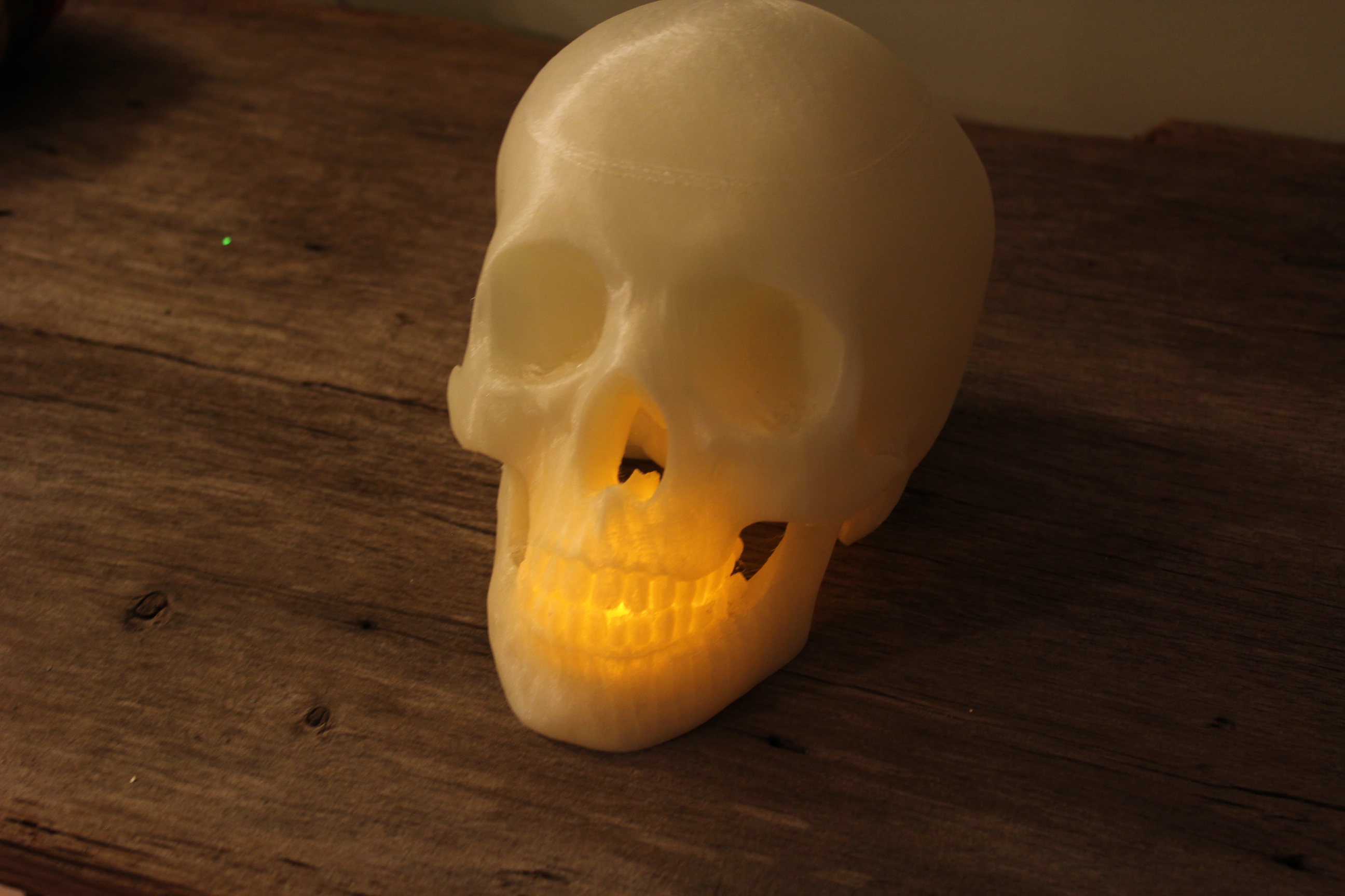This was a great model, just had to print it out at full size! https://grabcad.com/library/crystal-skull-1 by Steve Haines. Used glow in the dark PLA @ 2.5 layer height. 13.5 hrs . The "scar" near the top was from the autopsy. (hmm the filament had a whoops). :D