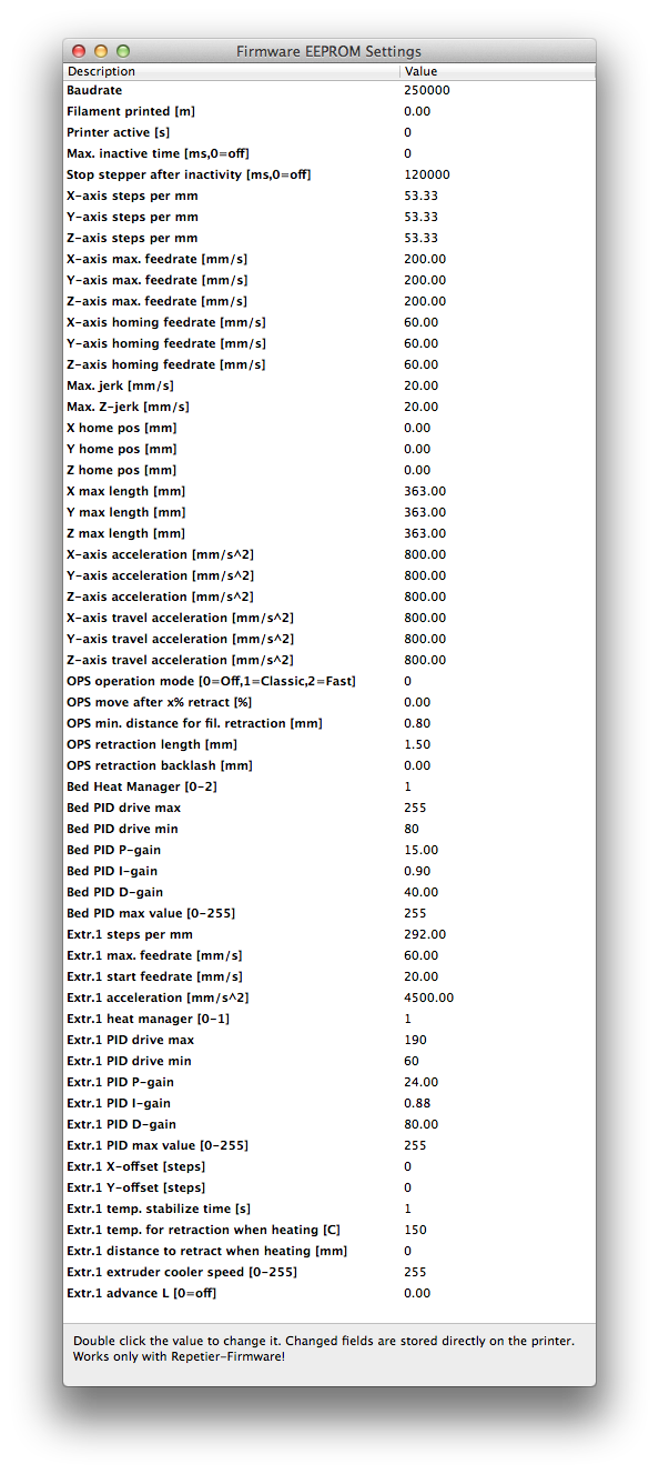 What value should be in there?mhackney wrote:Turns out that the 1.1 Rev of the RAMBo is 16 micro steps. I don't know how long this version has been out but it is what came with my kit. Simply changing:
