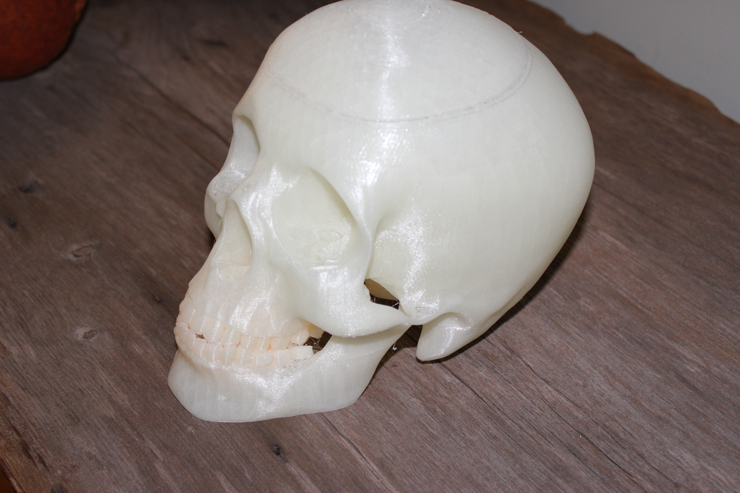 This was a great model, just had to print it out at full size! https://grabcad.com/library/crystal-skull-1 by Steve Haines. Used glow in the dark PLA @ 2.5 layer height. 13.5 hrs . The "scar" near the top was from the autopsy. (hmm the filament had a whoops). :D