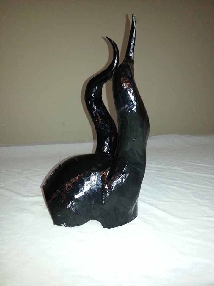 These are some shots of the Maleficent horns I'm making for a Halloween costume. The horns were printed in 6 separate pieces and then assembled. I then covered them in Worbla for the texture effect and will add paint and leather for the final finish. The design was created by Clay Cardwell (mrclaybo on the forum) and is available on Thingiverse here: