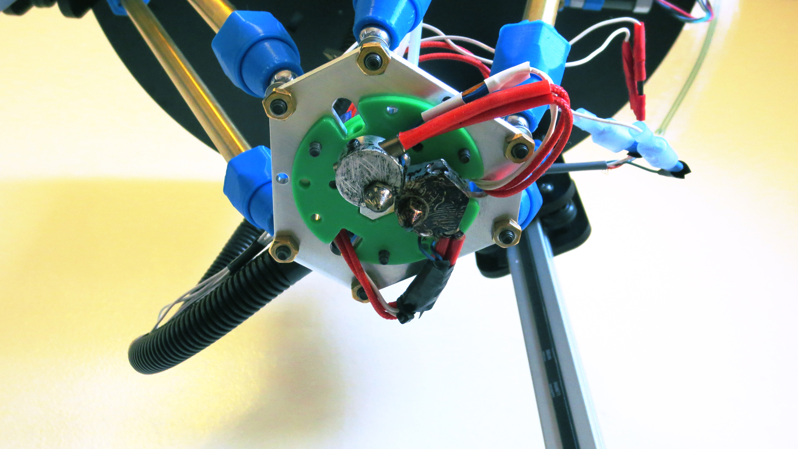 If you have the SeeMeCNC rostock effector on, there is a 40mm hole in the middle. The pictures show how the parts fit together; the adapter plate fits in the 40mm hole of the effector plate carriage and then the Tri hotend heat sink slides into that. The star shaped plate on top is only necessary if the fit isn't tight, in which case the plate clamps around the Tri hotend's groove and holds it down to the mounting plate. The 3 or 6 screw holes around the heat sink will fit either M4 (4mm) or #6 screws (imperial) to hold everything together.