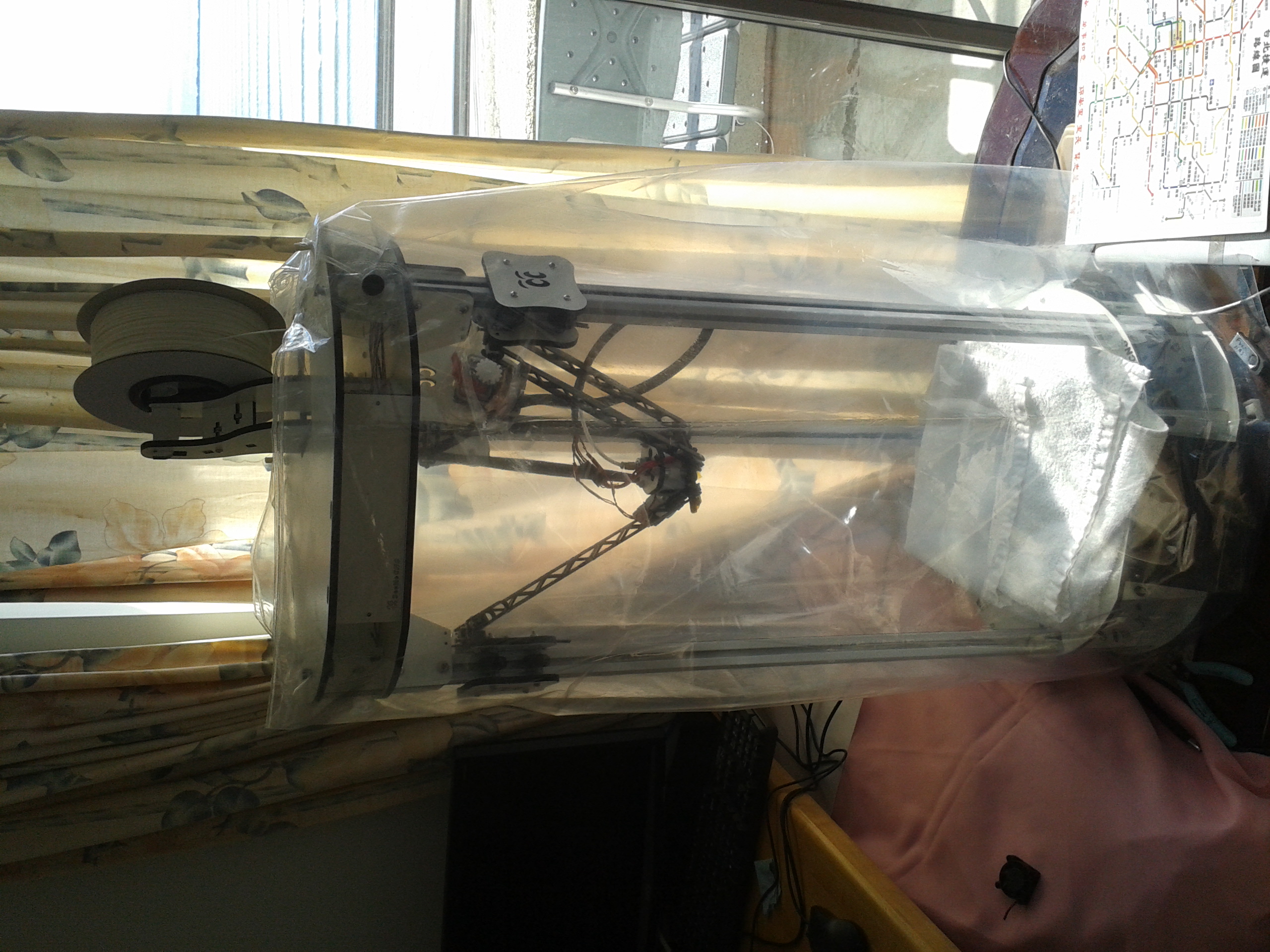 You buy a clear shower curtain, fold it in half length wise and you have a double layer plastic curtain which will retain heat. Minimal modification to your rostock and easily removed any time you want. You will need a hole puncher to put holes where you put the clips. Takes about 10 seconds to install or remove!