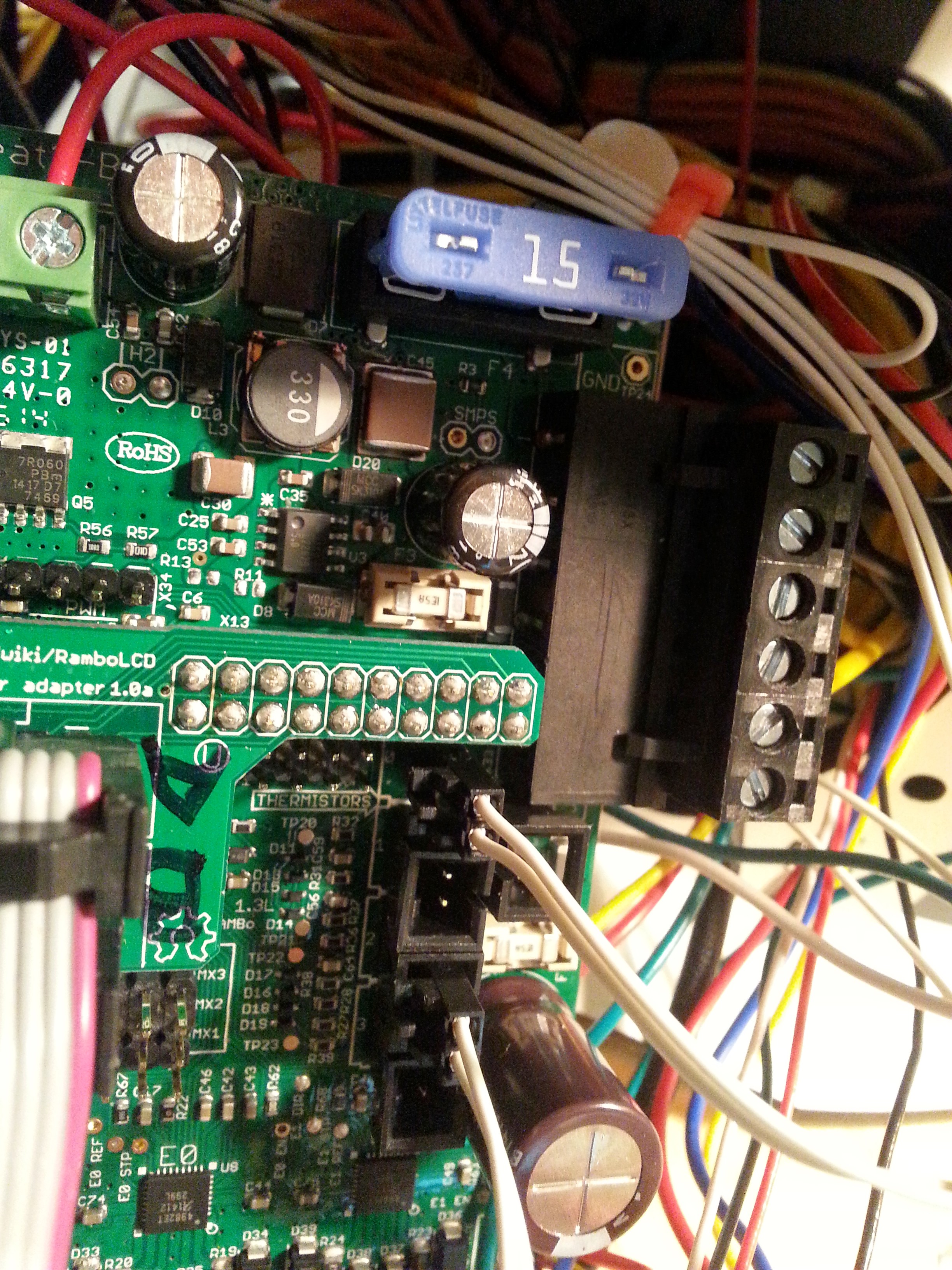 The thermistors both were reporting ~23C, but when I tried to turn the heat up (or on) the control panel shut down. This was true if I did it on the max lcd panel or thru Mattercontrol. The bed heat led will not come on. I pulled the bed and there were no wiring issues, bridges, shorts, or broken connections. I checked all the plug in & screw in connections on the rambo board but the issue persists. Again this issue is true of both the hot end and bed heat. All fuses were checked several times and are good to go. Again, no amount of force, wiggling, or jiggling could make these connections work.
