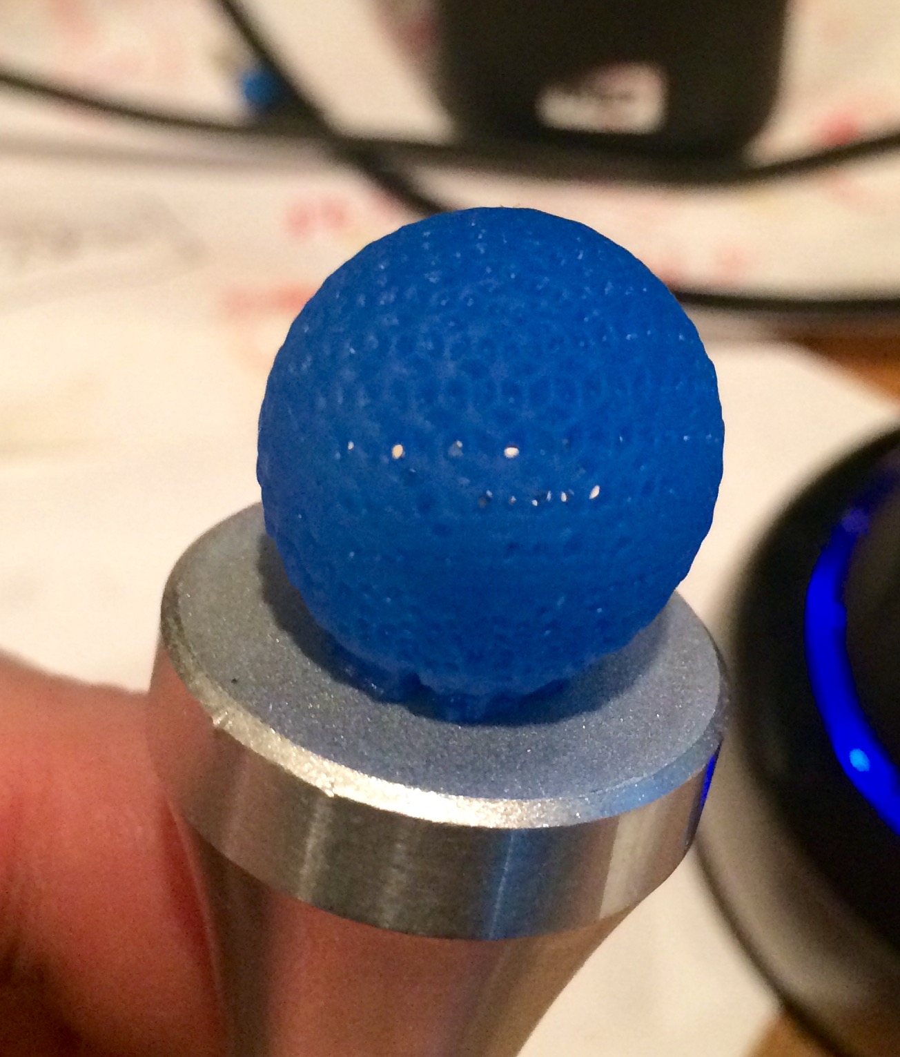 I can actually start to see some definition and porosity in the ball - and it's round! There is a post print cleanup/treatment process that I need to work out. I washed this one with ethanol since I didn't have any IPA. It actually seems to be getting better (pores opening up) as it sits here. But perhaps it is still a little overexposed.
