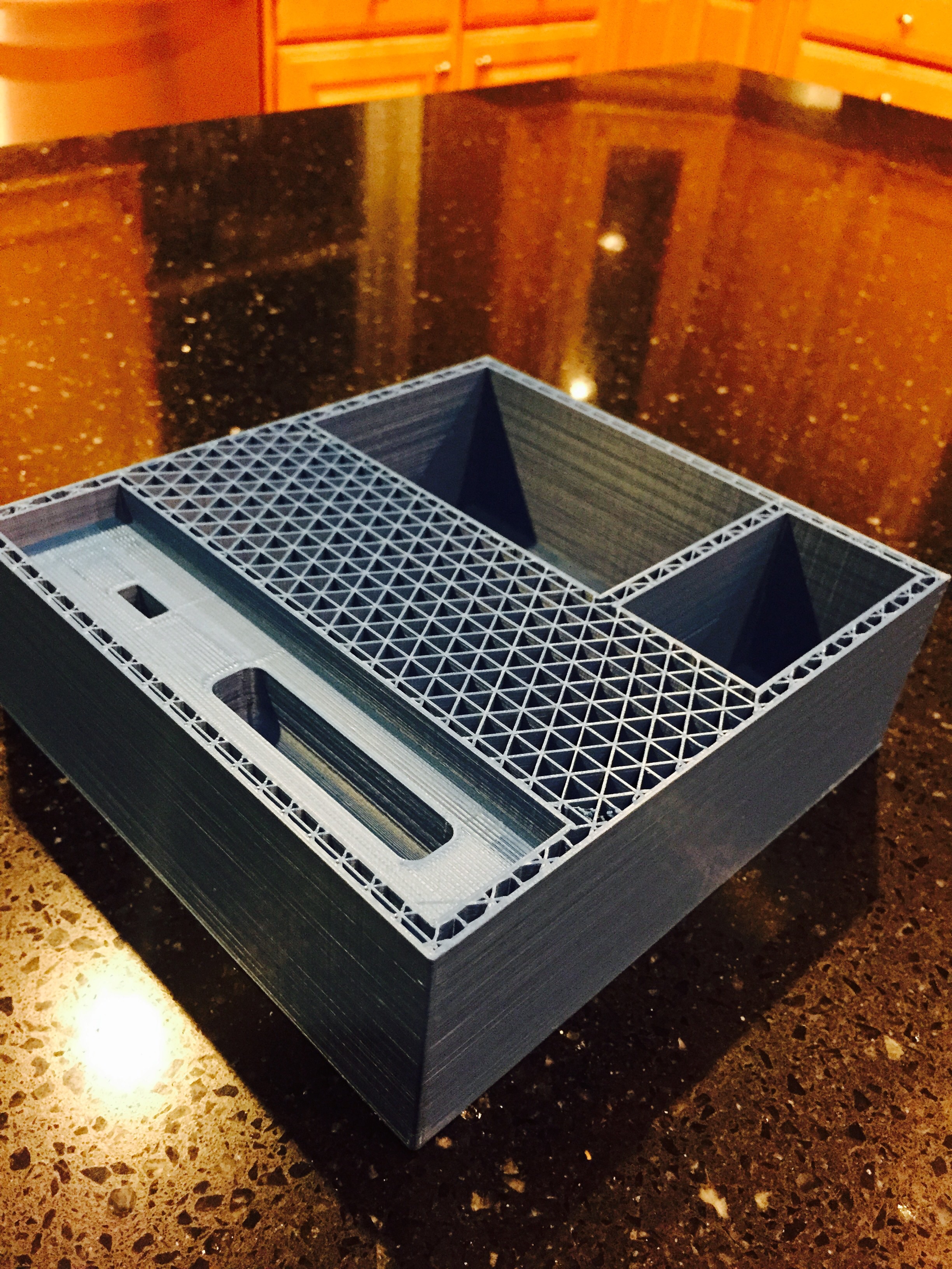 Next time I think I would do a couple different things. First would be to make the walls thinner since they don't need to be 5 mm and would same filament and shorten the print time. As well, I would not build as much support material in the drawer cavity. I've never used PLA, and maybe with a layer fan I wouldnt need to have support material at all.