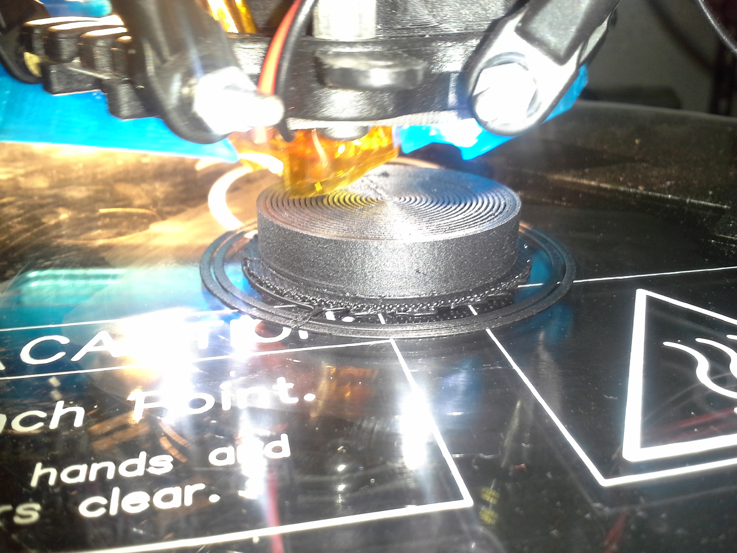 @ 235/90, enabling wiping while retracting, retracting 4mm at 45mm/second and printing at around 80 to 100mm per second, I got away from curled edges and blobs, and started getting into good print territory. Less than 235, I was having layer adhesion issues with the black ABS I bought from Frys. Shaxon or something.