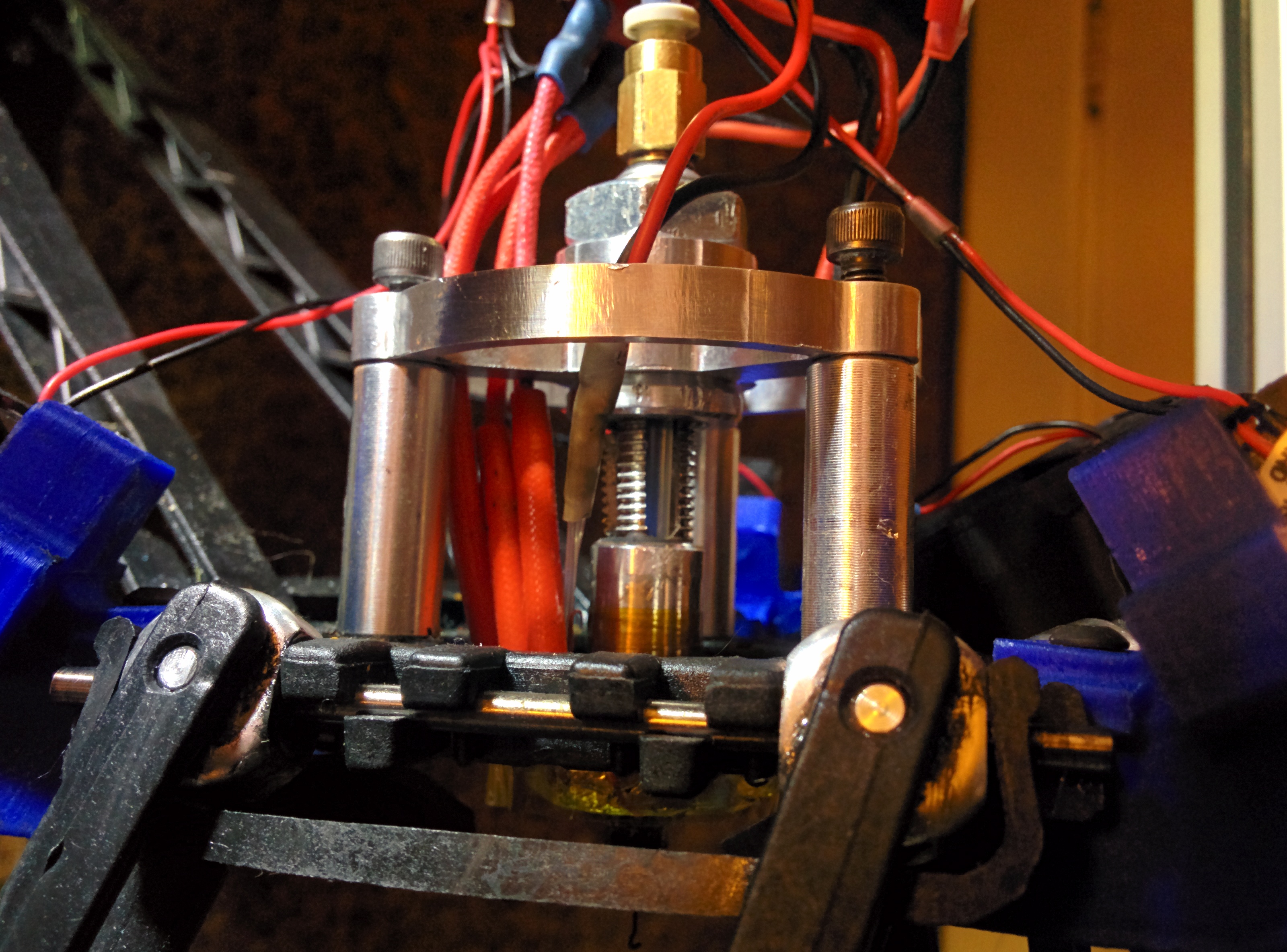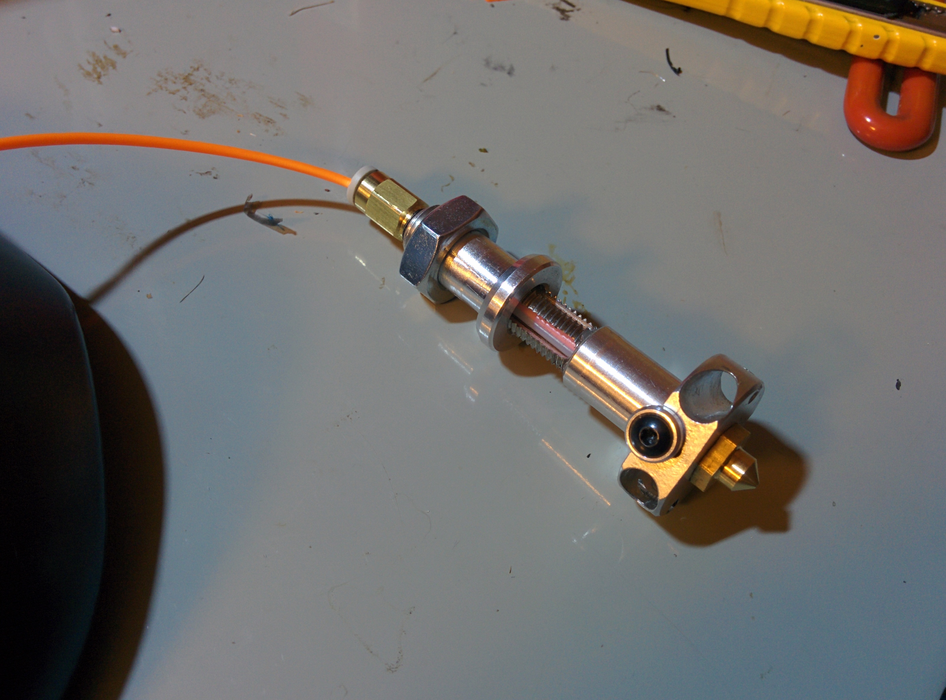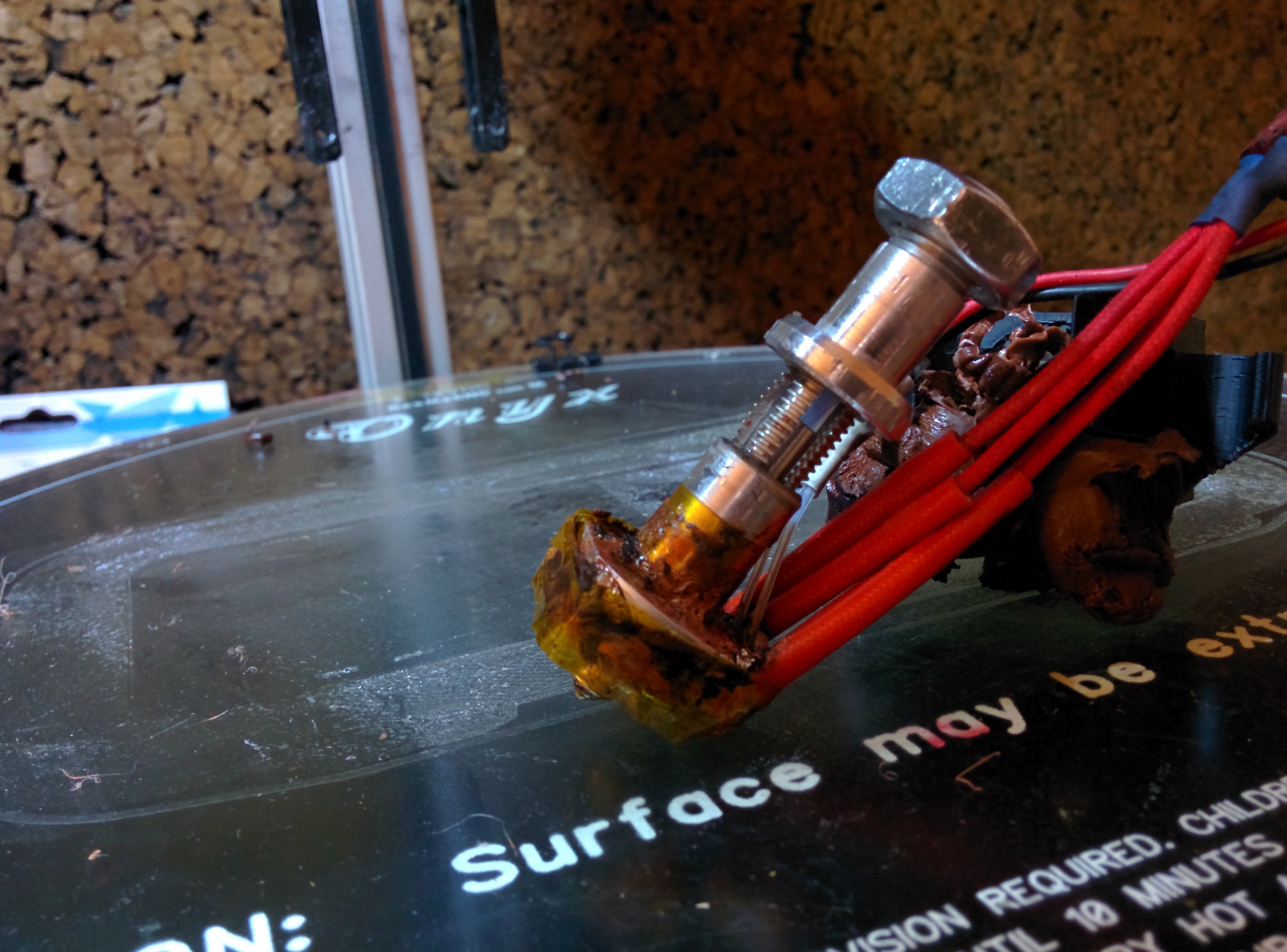 So I cranked it up to eleven, and fired up a 14 hour print (ABS) at 275C. Long print, so I threw a trashbag over the printer. The next day, the print was done, but was really looking underextruded. When I fully uncovered the printer, I found I had spring a leak.