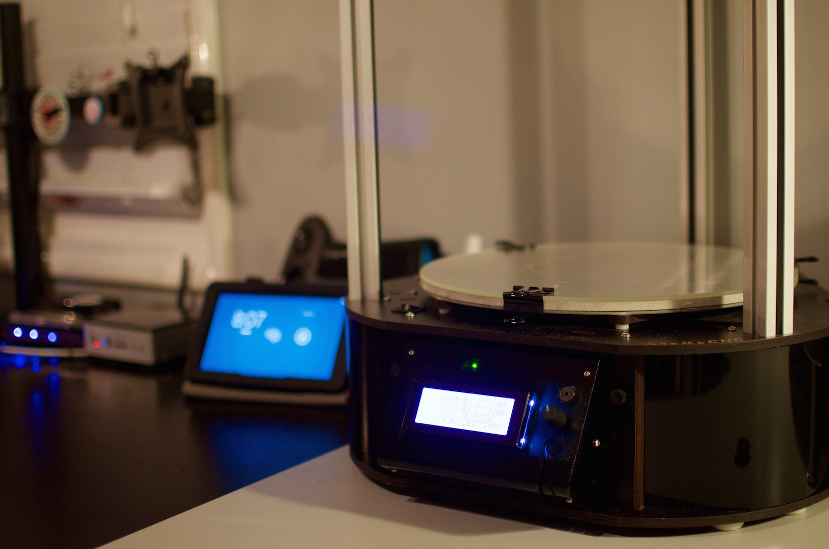 I got my Rostock Max v2 at Maker Faire Bay Area 2014 and never actually got around to sharing my setup, so here are some photos featuring my printer in all its glory: