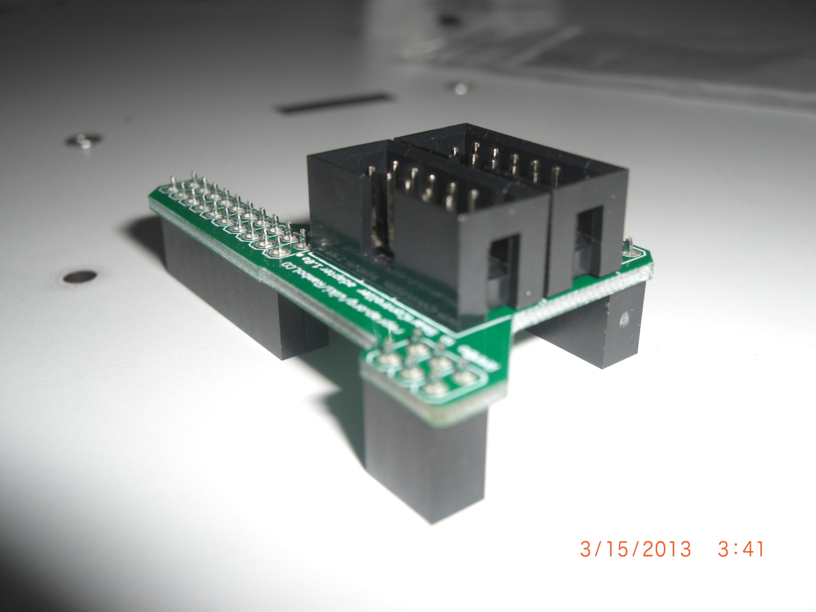The final result. I recommend soldering the two 10 pin headers first. Then turn it over and solder the others. This will allow you more room to solder without the other headers in your way.