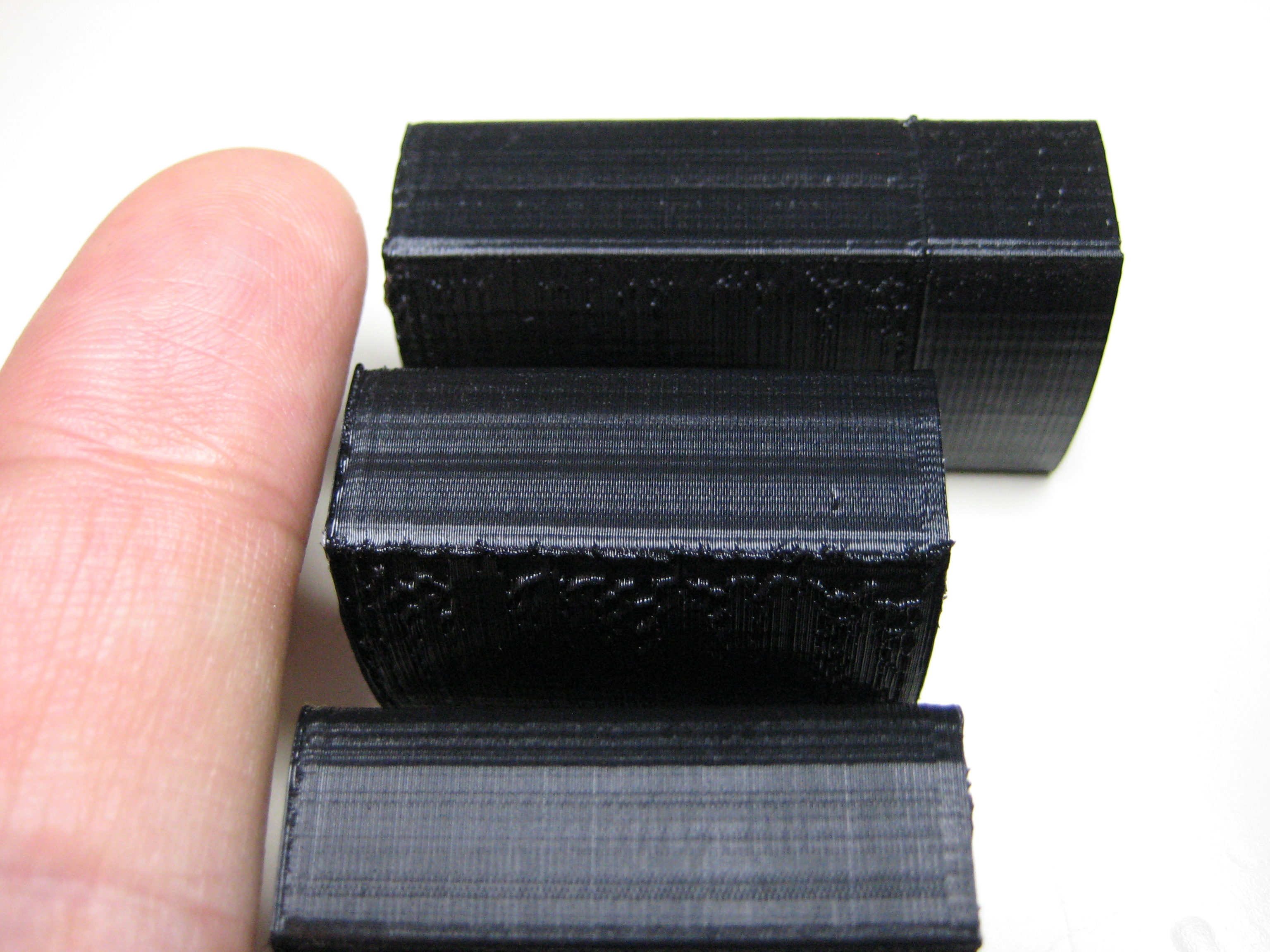 Hi there, my Rostock has been dialed in rather ok. I tried slic3r in the beginning and changed to Kiss later on. I think that Kiss produces better G-Code in most cases. So i modelled and printed a hanger for my bathroom door and it works well. But take a look at its structure. It seems like the layer is oscilating somehow. It is a perfect repeating pattern. Any idea what the reason could be? and . Now yesterday i played with a different ABS plastic (Black one) and i printed out a box. Yeah i know its not perfect, but again i had some repeating patterns that i coudl not find what to do against but they do look different. . Also i recognize that in the beginning the extrusion of the filament seems to be "late" and the some layers look like the flow is to low but i print at rather slow speed and the rest of the layers look right. Any ideas?