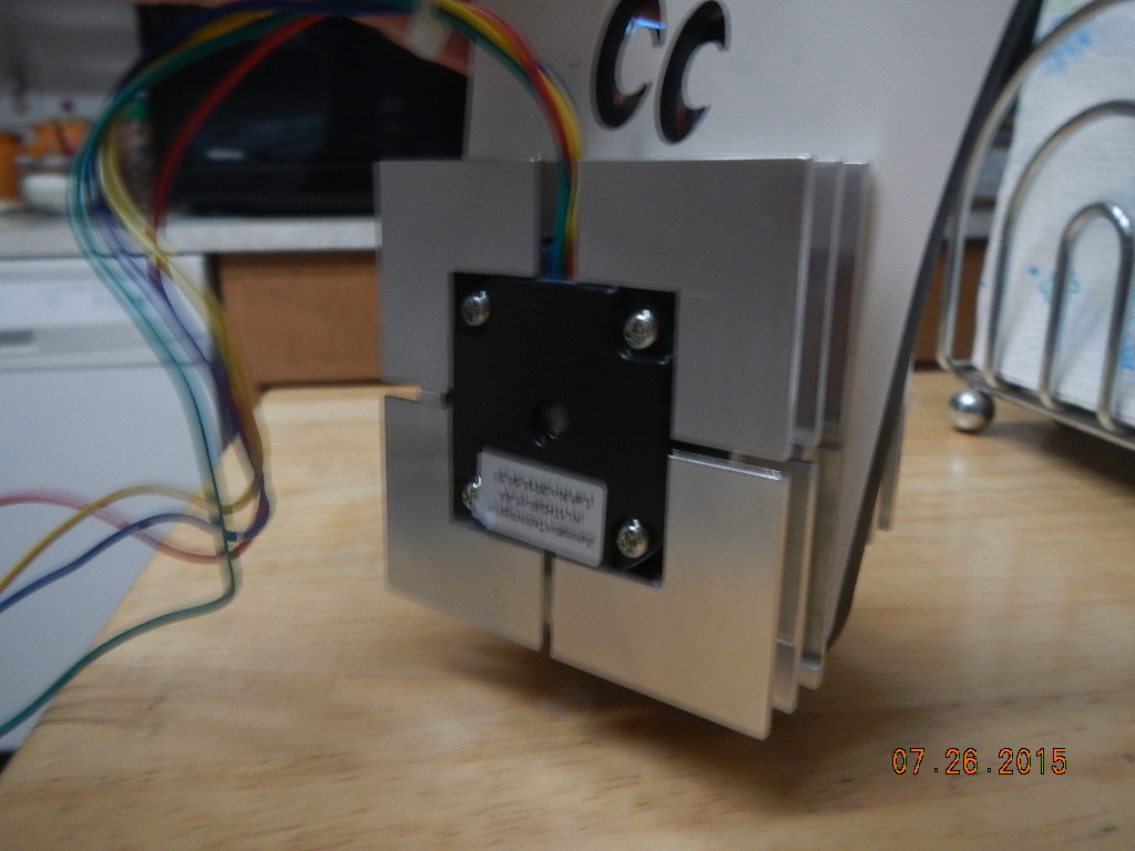As Tincho85 said you can buy a fan cheap. But the way it;s mounted at the end of the stepper motor, which make's about a 20% contact with it. The place that needs to be cooled is the hobbed gear end. The fan also uses energy. The system that I have designed is designed to fit right on the stock Rostock Max 2, with tie wraps or leather string to shrink it tight, now contact is about 80%, now without a fan I have checked it constantly through over 20 hours run time. Used an inferred thermometer, Rear staying below 39C Front face average 2C lower, and hobbed gear average 34C. and in all the hours, no build up in the gear. The sinks are about 3" sq, to gain as mush surface area as possible.